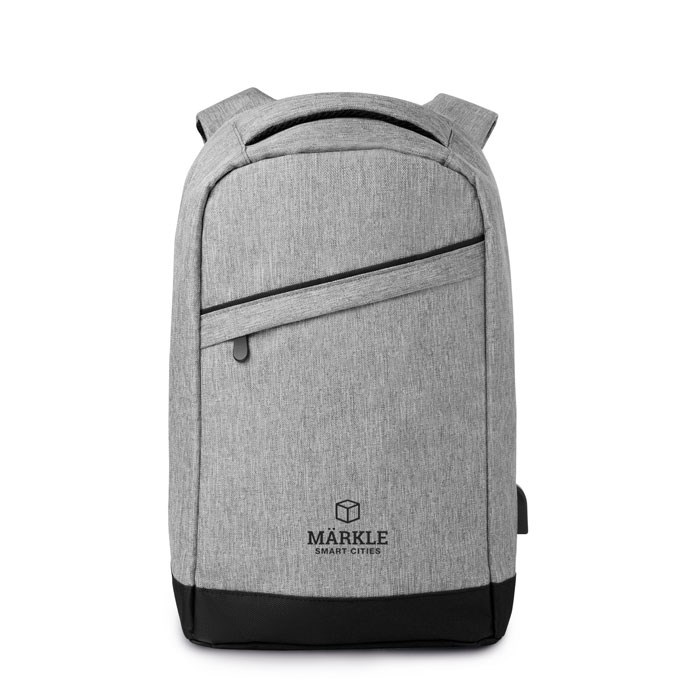 Rucksack mit großem Hauptfach. Inkl. 13 Inch Laptopfach und USB- Ladekabel. Rückseitiges Innenfach mit Reißverschluss für optimalen Schutz. Gepolsterte Schultergurte. 600D 2farbiger Polyester.