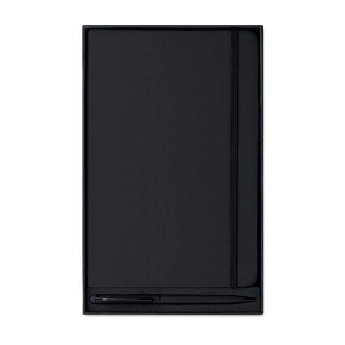 DIN A5 Notizbuch mit Hard Cover. 72 Blatt (144 Seiten) liniertes Papier. Farblich abgestimmter Kugelschreiber mit Stylus. Blaue Tinte. Elastisches Verschlussband, Lesebändchen und Stiftschlaufe.