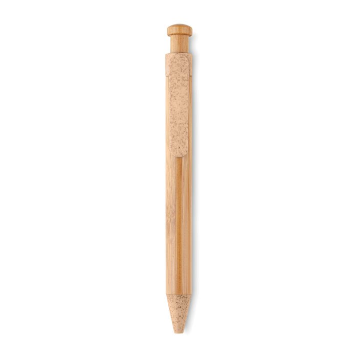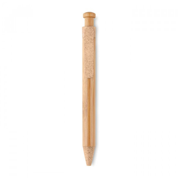 Druckkugelschreiber mit Schaft aus Bambus und Details aus umweltfreundlichen Weizenstrohhalm- und ABS-Kunststoff Gemisch (je 50%). Blaue Tinte. Bambus ist ein natürliches Produkt, es kann daher zu leichten Abweichungen in Farbe, Dekor und Maßen kommen.