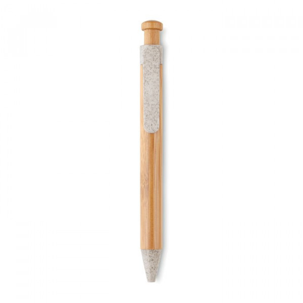 Druckkugelschreiber mit Schaft aus Bambus und Details aus umweltfreundlichen Weizenstrohhalm- und ABS-Kunststoff Gemisch (je 50%). Blaue Tinte. Bambus ist ein natürliches Produkt, es kann daher zu leichten Abweichungen in Farbe, Dekor und Maßen kommen.