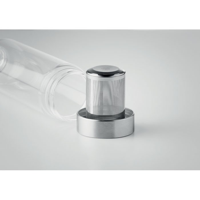Einwandige Trinkflasche aus Borsilikat-Glas. Mit Tee-Sieb und Neopren- Schutzhülle. Füllmenge: 500 ml. Nicht geeignet für kohlensäurehaltige Getränke. Auslaufsicher. Eine Lasergravur ist auf Borosilikatglas nicht möglich.