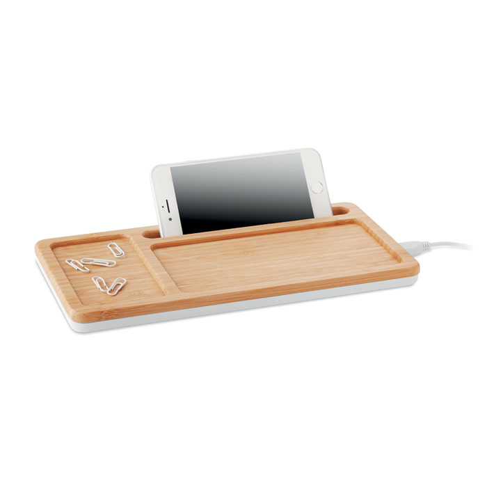 Organizer mit induktiver Ladestation. Bambus-Oberfläche. Inkl. Typ-C- Adapter, USB-Hub und Smartphone Halter. USB Ausgang DC5V/1A. Kabelloser Ausgangsstrom: DC5V/1A (5W). Kompatibel mit den neuesten Android Smartphones, iPhone® 8, 8S und X und höher. Bambus ist ein natürliches Produkt, es kann daher zu leichten Abweichungen in Farbe, Dekor und Maßen kommen.