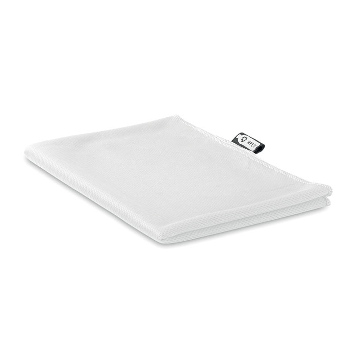 Sporthandtuch aus RPET. Dieses Handtuch hat eine höhere Saugkraft als ein normales Handtuch. Ideal für den Sport. Es wird in einem Non Woven RPET-Netzbeutel geliefert, sodass es praktisch mitzunehmen ist. Sowohl das Handtuch als auch der Netzbeutel sind aus recyceltem PET hergestellt, was dieses Produkt zu einer nachhaltigen Wahl macht. Maße: 30x80 cm.