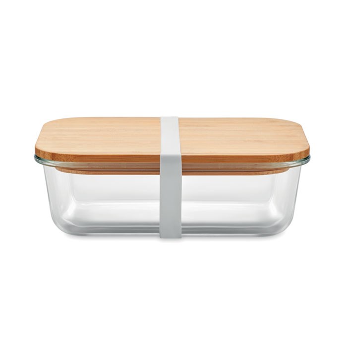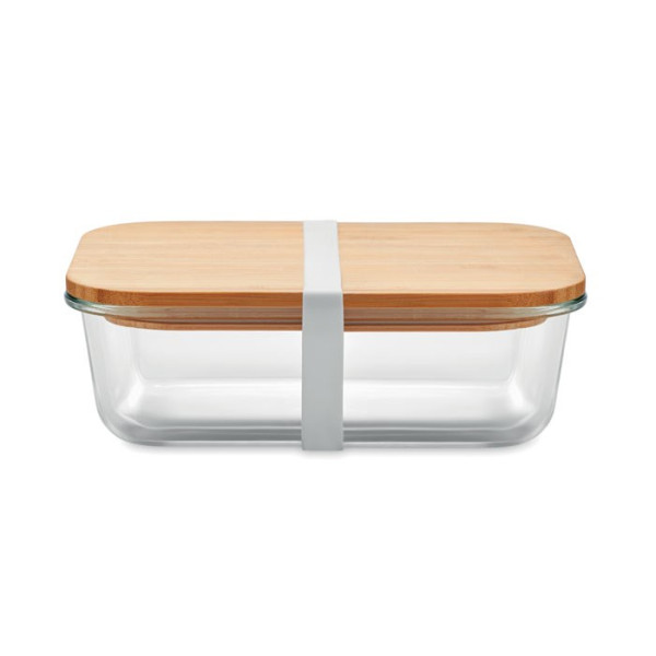 Lunchbox aus Glas mit Deckel aus Bambus und Verschluss-Band aus Silikon. Füllmenge: 800 ml. Da Bambus ein natürliches Material ist, können Farbton und Maße pro Artikel variieren. Dies kann zu Abweichungen im Ergebnis der Veredlung führen.