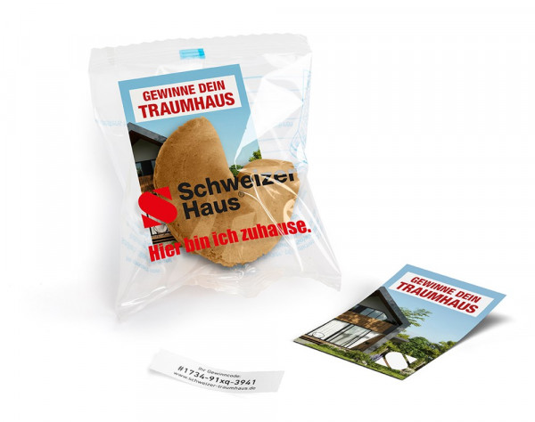 Eine Werbebotschaft mit Biss sind unsere Glückskekse in fünf Farben (natur, schwarz, rot, grün, gelb). Die Botschaft im Glückskeks kann individuell formuliert werden, wie z. B. einen Gutscheincode. Zusätzlich liegt eine beidseitig individuell bedruckbare Karte bei. Verpackt werden unsere Glückskekse im individuell veredelten Werbetütchen.