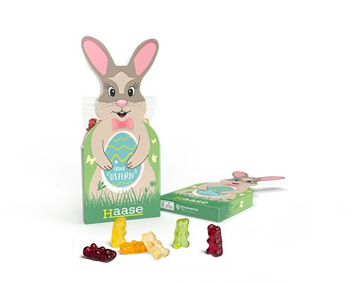 Das 100g Fruchtgummi ist auch in der Osterausführung verfügbar und in einer individuell bedruckbaren Osterhasen-Kartonage aus FSC®-zertifiziertem Karton zu haben.