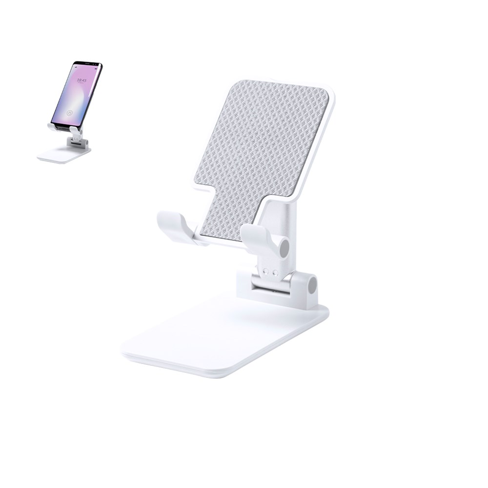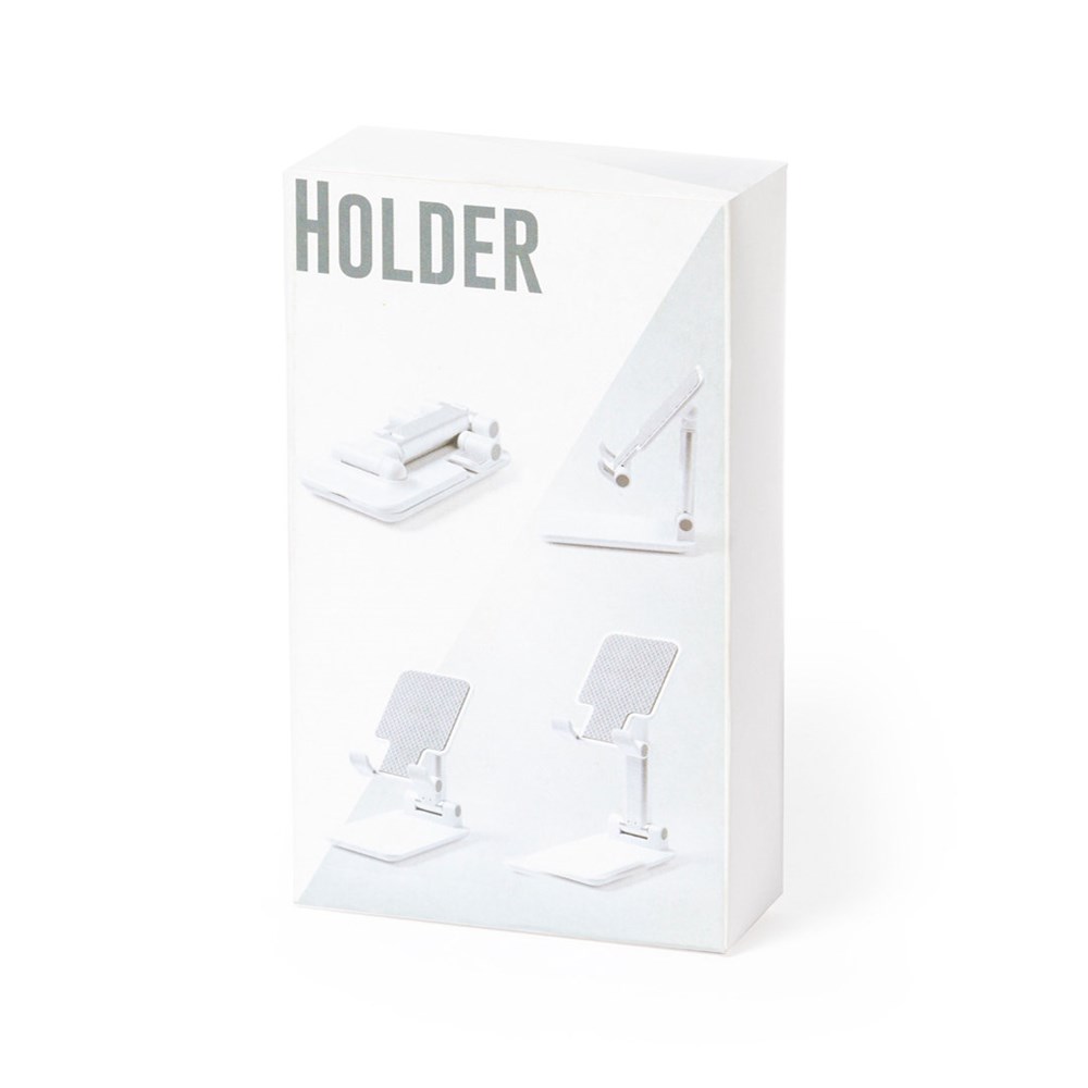 Faltbarer Ständer für Smartphones und Tablets. Höhenverstellbar, inklusive rutschfesten Gummischutz an der Basis und Stütze. In schlichtem Weiß und mit großer Beschriftungsfläche, besonders geeignet für den Tampondruck. Präsentiert in einer attraktiven Designbox.
