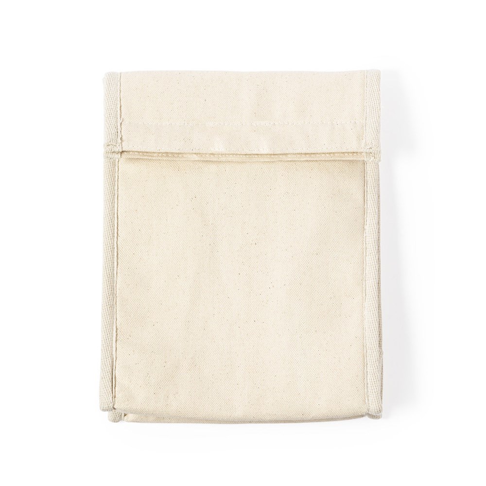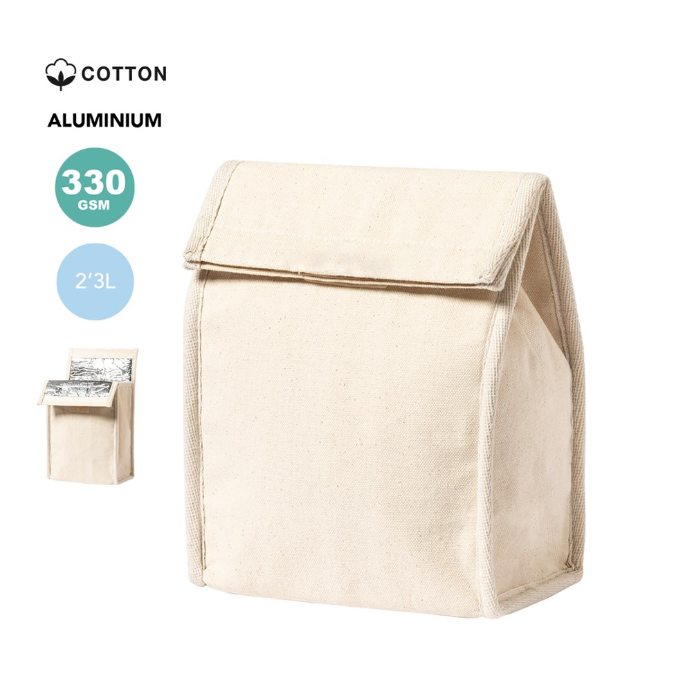 Thermotasche aus widerstandsfähigem 330g / m2 100% Baumwollmaterial. Hauptfach mit Klettverschluss und isothermischem Aluminium-Innenraum. Fassungsvermögen 2,3l.