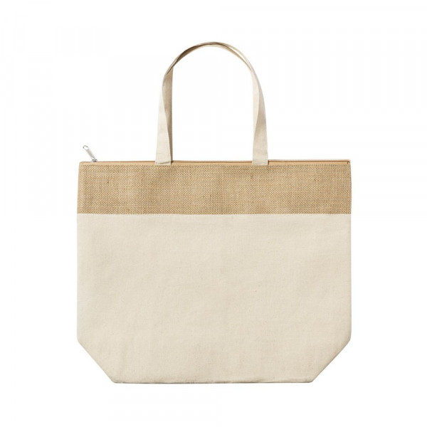 Thermotasche aus widerstandsfähigem 100% Baumwollmaterial von 225g / m2, mit laminiertem Juteoberteil und Baumwollgriffen. Hauptfach mit Reißverschluss und Metallschieber, mit isothermer Aluminium-Innenausstattung. Genähtes Finish, mit verstärkten mittleren Griffen und einer Widerstandsfähigkeit von bis zu 7 kg.