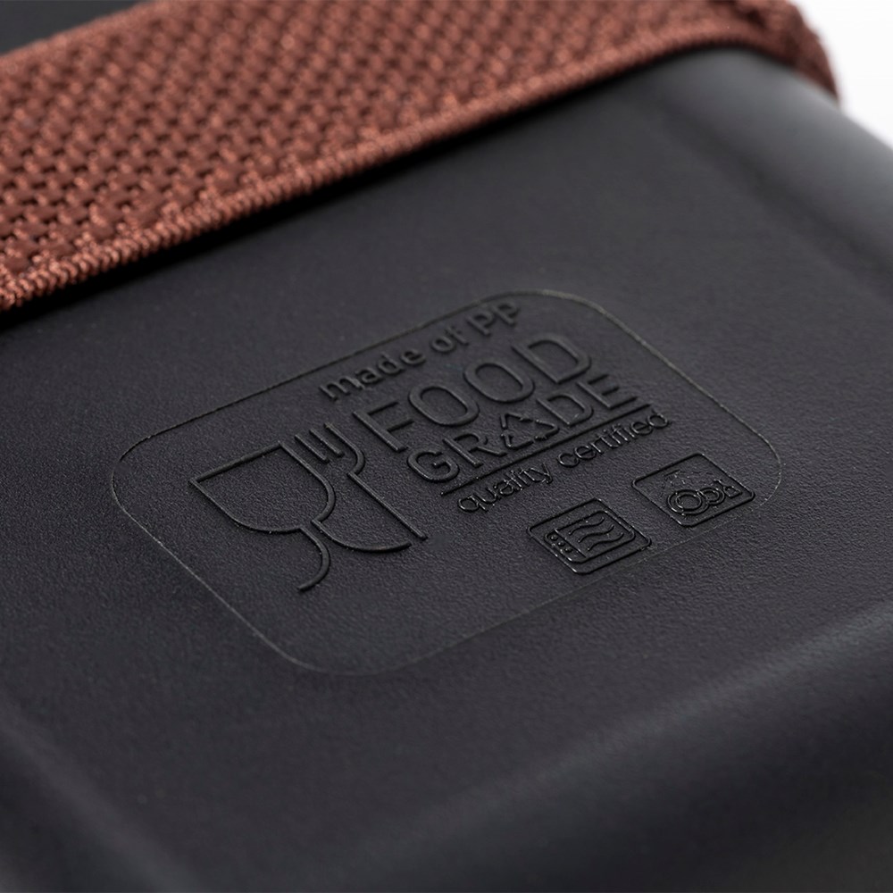 1l Brotdose aus widerstandsfähigem BPA-freiem PP-Kornmaterial, mit Bambusdeckel. Elastisches Sicherheitsband auf dem Deckel und Food Grade-Zertifizierung, die die Sicherheit beim Kontakt von Lebensmitteln mit dem zur Herstellung des Produkts verwendeten Material garantieren.