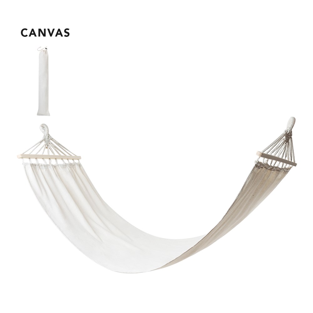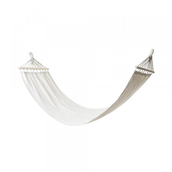 Hängematte aus widerstandsfähigem Canvas von 320g / m2 und 190x80cm. Mit widerstandsfähigen Zurrgurten und Stützen aus Naturholz. Unterstützt bis zu 120 kg. Präsentiert in einem passenden Canvas-Einband.