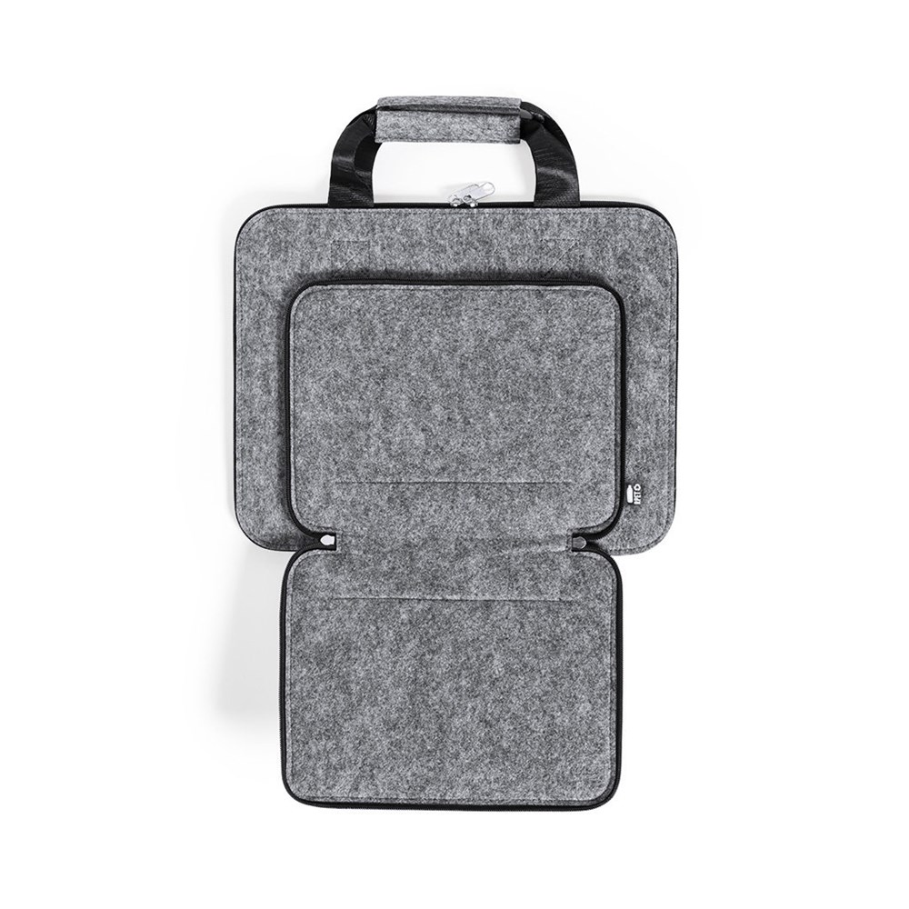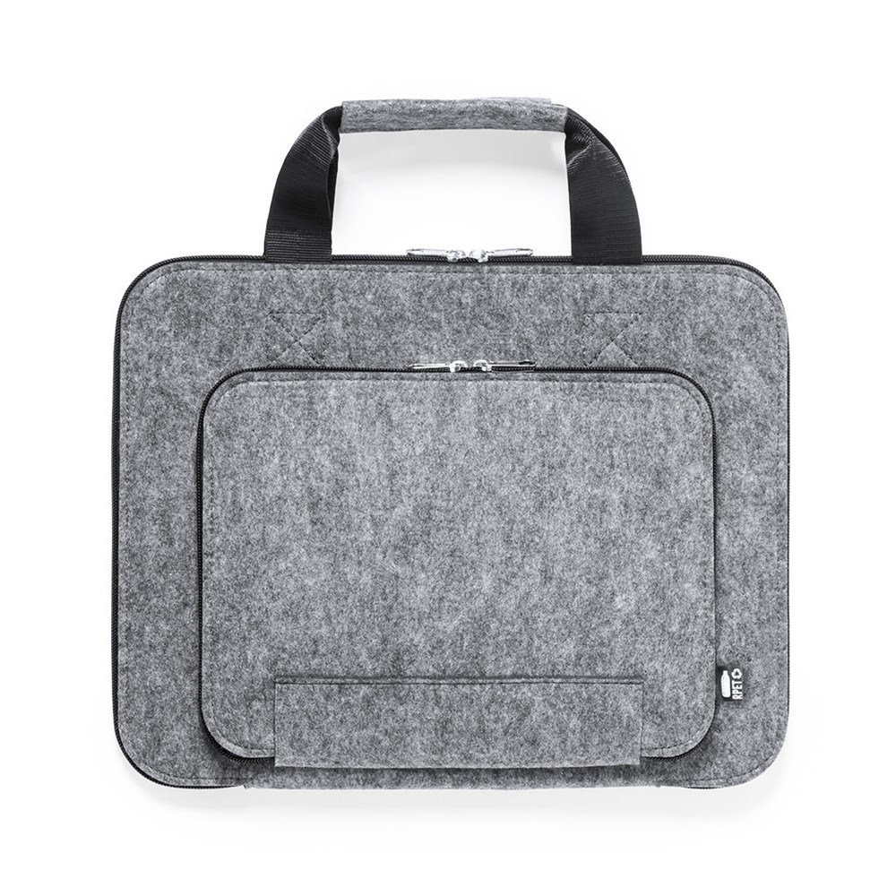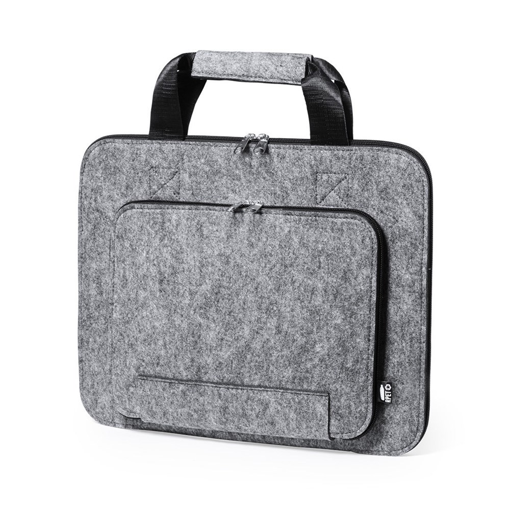 Dokumentenmappe der Liene "Natur" aus widerstandsfähigem recyceltem RPET-Filz, das Ergebnis der Kombination des Recyclingprozesses von Kunststoffmaterialien mit der alten Technik der Filzherstellung, was zu einem Öko-Trend-Material führt, das nicht nur recycelten Ursprungs ist, sondern auch wird auch wiederverwertbar. Haupt- und Fronttaschen mit Reißverschluss und Metallschiebern, mit passenden verstärkten Griffen und markantem RPET auf dem äußeren Etikett.