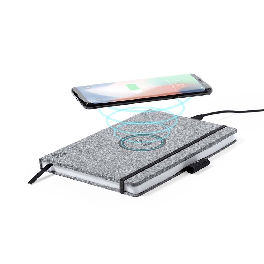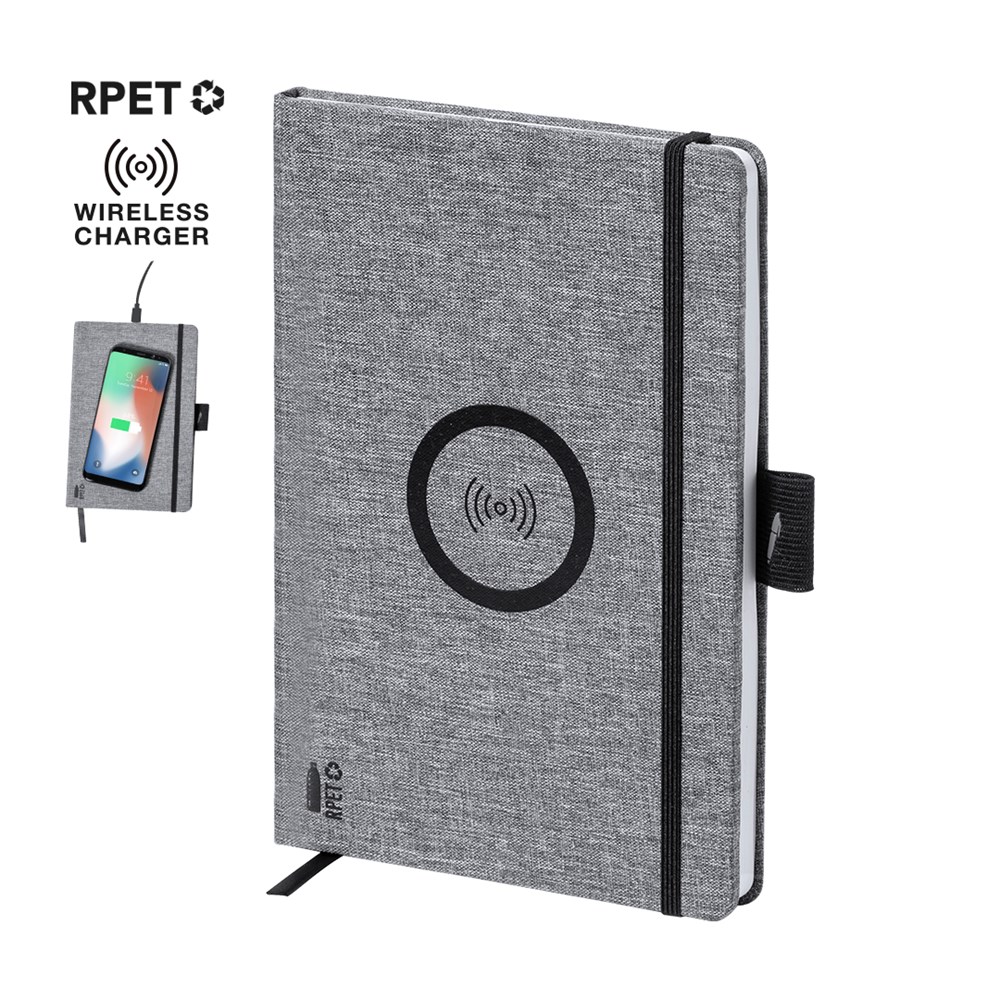 Charger-Notizblock der Liene "Natur" aus widerstandsfähigem Polyester 300D RPET im A5-Format und aus recyceltem Kunststoff, um die Wiederverwendung von Kunststoffabfällen zu fördern und die Nachhaltigkeit des Planeten zu unterstützen. Mit in die Abdeckung integriertem kabellosem 10W-Ladegerät. Enthält 80 Blätter mit Anordnung zu einer Linie. Kompatibel mit Smartphones mit kabelloser Ladetechnologie. Ladekabel Typ C im Lieferumfang enthalten und Bedienungsanleitung in Spanisch und Englisch erhältlich.