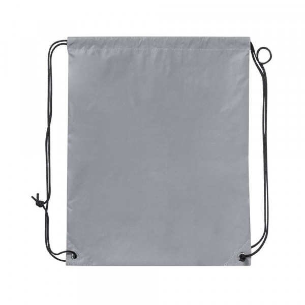 Weicher 210T Polyester-Seilrucksack. Hergestellt aus Gewebe mit hoher Lichtreflexionsfähigkeit dank Millionen reflektierender Pigmente und basierend auf dem Prinzip der Retroreflexion des Lichts, einer Eigenschaft der Nachtsichtbarkeit, die aus der Brechung des Lichts in Richtung der Quelle besteht gleich. Mit schwarzen selbstschließenden Kordeln und Metallringen. Widerstand bis zu 7 kg Gewicht und beständig gegen Wasser.