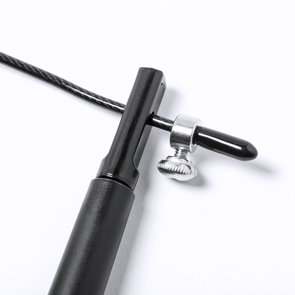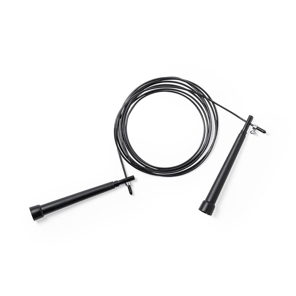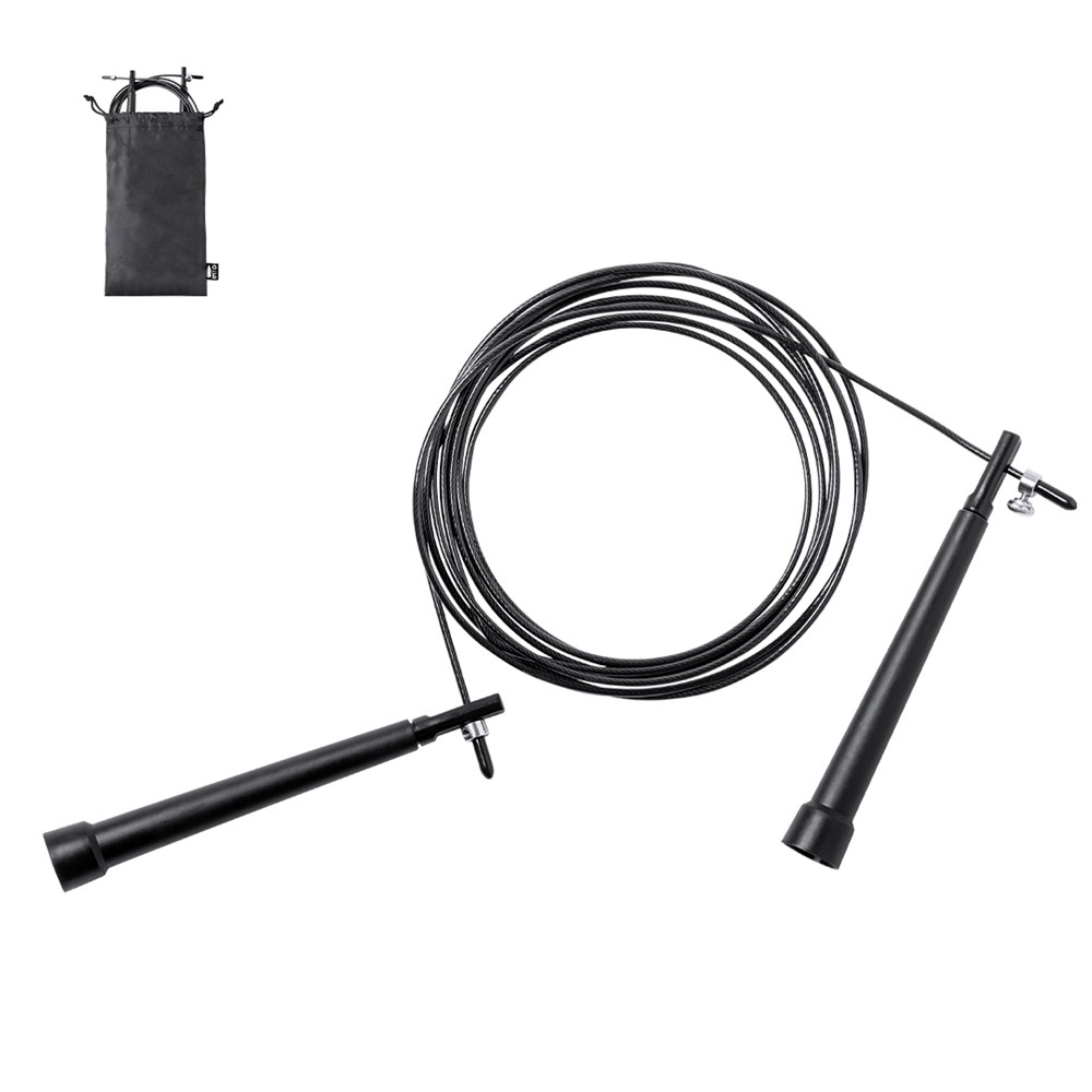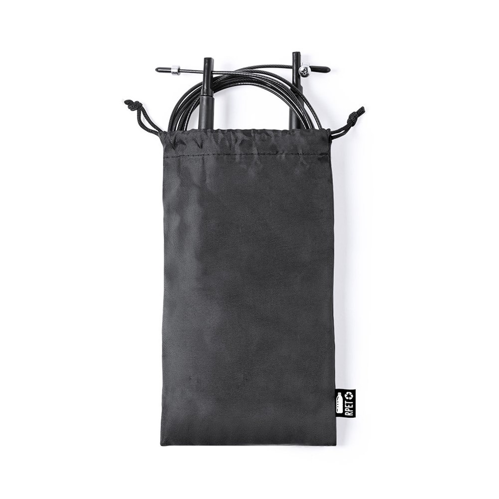 Hochwertiges, 3 m langes, verstellbares, extra langes Seil aus Stahl mit einer robusten PVC-Beschichtung. Mit ergonomischen Griffen und in einer RPET-Polyesterhülle mit Kordelzugverschluss, hergestellt aus recyceltem Kunststoff, um die Wiederverwendung von Kunststoffabfällen zu fördern und zur Nachhaltigkeit des Planeten beizutragen. Unverwechselbares RPET-Etikett auf die Hülle.