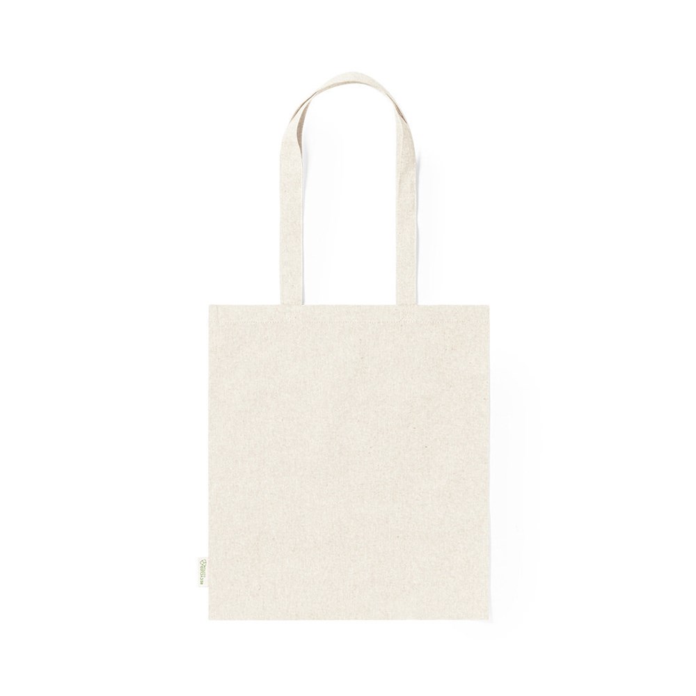 Tasche aus 100% recyceltem Baumwollmaterial 140g/m2. GRS-Zertifizierung (Global Recycled Standard) die die recycelte Herkunft des für die Herstellung des Produkts verwendeten Materials garantiert. Genäht, mit 70 cm langen, verstärkten Griffen und in einer breiten Farbpalette erhältlich. Widerstandsfähigkeit bis zu 8 kg, einschließlich Etikett aus recycelter Baumwolle.