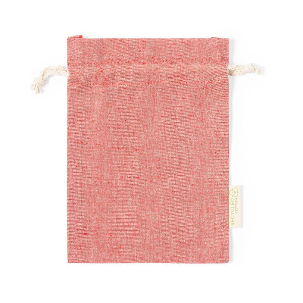 Umweltfreundliche Tasche aus widerstandsfähigem, 100 % recyceltem Baumwollmaterial von 120 g/m2. GRS-Zertifizierung (Global Recycled Standard), die die recycelte Herkunft des für die Herstellung des Produkts verwendeten Materials garantiert. Kordelzugverschluss aus Baumwolle und genähtes Finish, einschließlich Außenetikett mit Logo aus recycelter Baumwolle.