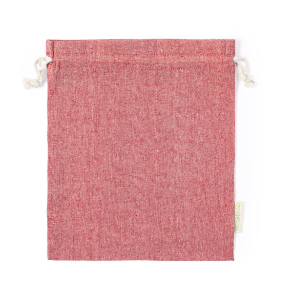 Umweltfreundliche Tasche aus widerstandsfähigem und 100 % recyceltem Baumwollmaterial von 120 g/m2. GRS-Zertifizierung (Global Recycled Standard), die die recycelte Herkunft des für die Herstellung des Produkts verwendeten Materials garantiert. Kordelzugverschluss aus Baumwolle und genähtes Finish, einschließlich Außenetikett mit Logo aus recycelter Baumwolle.