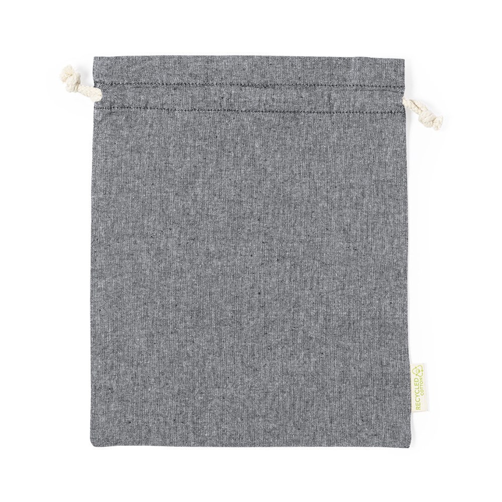 Umweltfreundliche Tasche aus widerstandsfähigem und 100 % recyceltem Baumwollmaterial von 120 g/m2. GRS-Zertifizierung (Global Recycled Standard), die die recycelte Herkunft des für die Herstellung des Produkts verwendeten Materials garantiert. Kordelzugverschluss aus Baumwolle und genähtes Finish, einschließlich Außenetikett mit Logo aus recycelter Baumwolle.