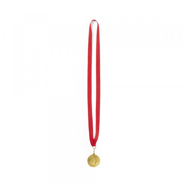 Goldgeprägte Metallmedaille. Mit rotem Polyesterband, passendem Metallkarabiner und speziell für die Lasergravur entworfen.