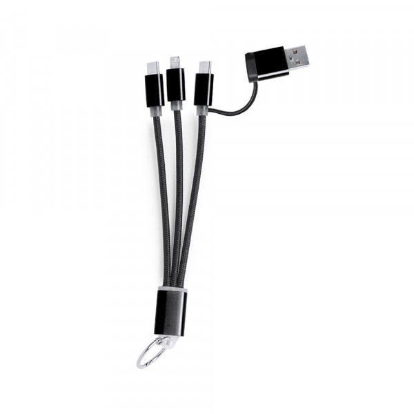 Ladekabel mit zwei Micro-USB/Lightning- und Typ-C-Anschlüssen (Eingang und Ausgang). Aluminiumanschlüsse und Metallplakette speziell für die Lasergravur entwickelt.