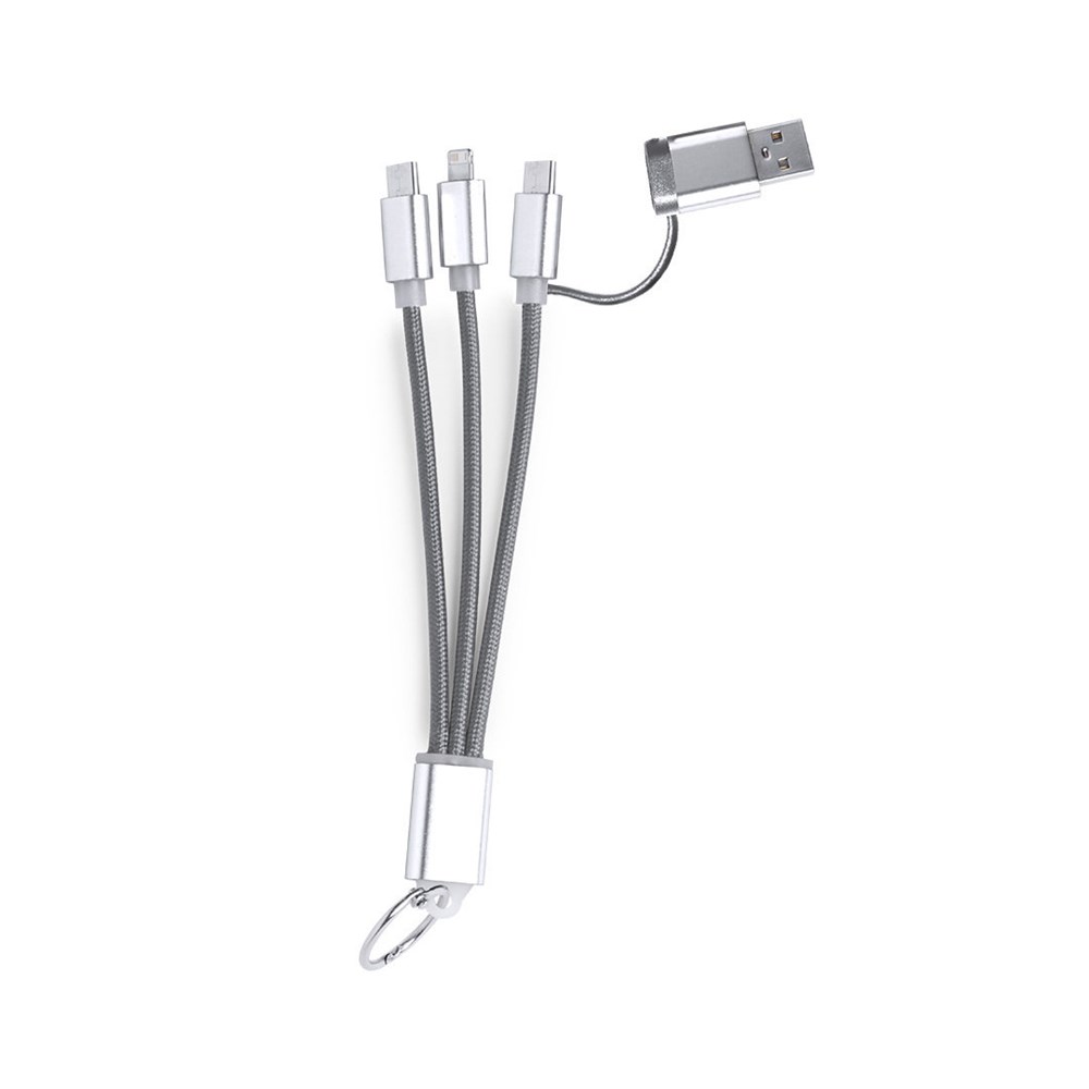 Ladekabel mit zwei Micro-USB/Lightning- und Typ-C-Anschlüssen (Eingang und Ausgang). Aluminiumanschlüsse und Metallplakette speziell für die Lasergravur entwickelt.