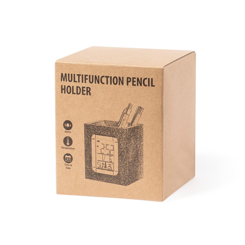 Linie "Natur" Stifthalter mit integrierter Multifunktionsuhr. Aus Naturkork, mit Thermometer, Kalender und Alarmfunktion. Batteriebetrieben (Knopfbatterien im Lieferumfang enthalten) und in einer attraktiven Öko-Design-Box präsentiert.