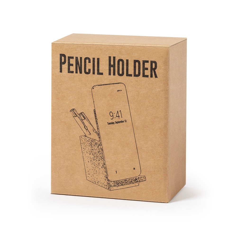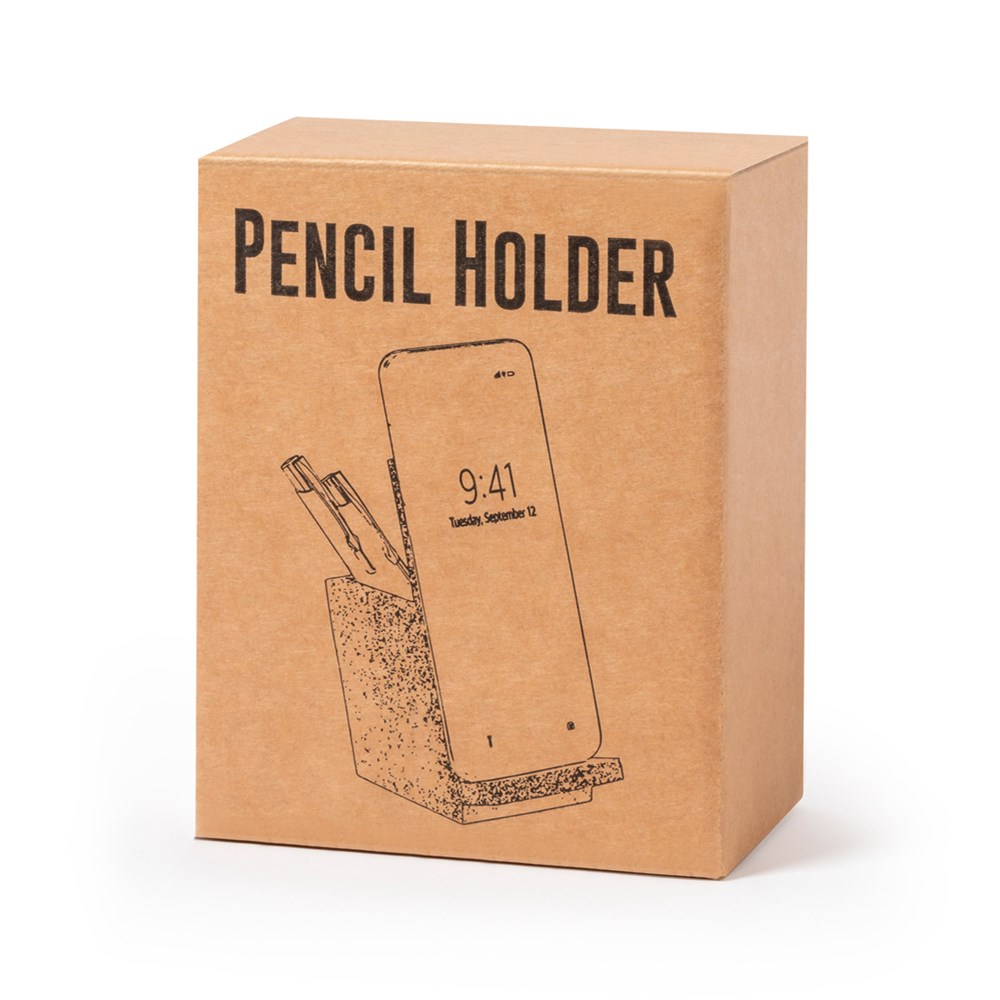 Linie "Natur" Stifthalter mit integriertem Smartphone-Halter. Hergestellt aus Kork, um die Verwendung von natürlichen Rohstoffen zu fördern, und präsentiert in einer attraktiven Öko-Design-Box.