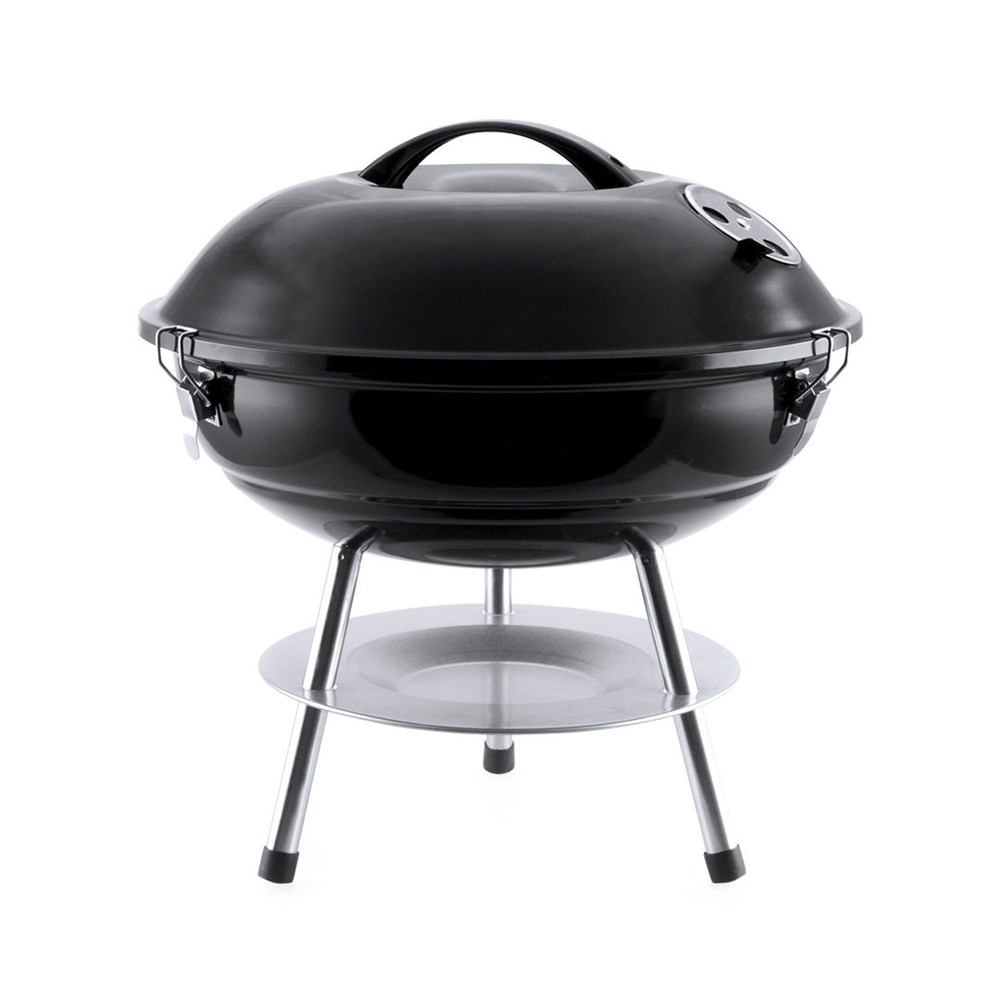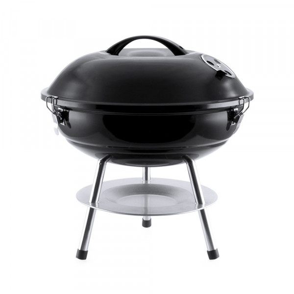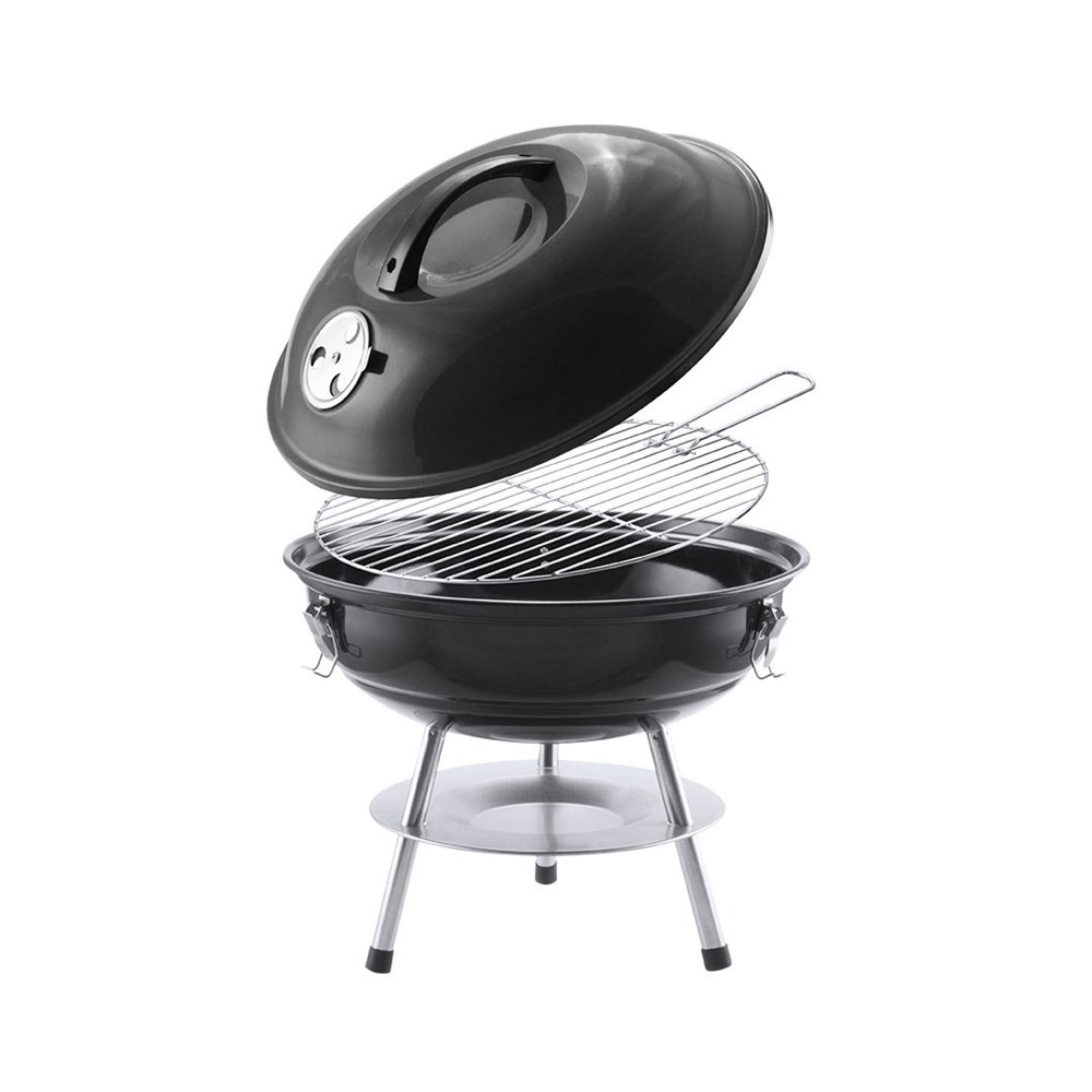 Grill aus widerstandsfähigem Kohlenstoffstahl mit schwarzer Oberfläche. Deckel mit komfortablem Griff und Lüftungslöchern, mit Metallgitter, Tropfschutzplatte und rutschfesten Füßen. Präsentiert in einer attraktiven Designbox.