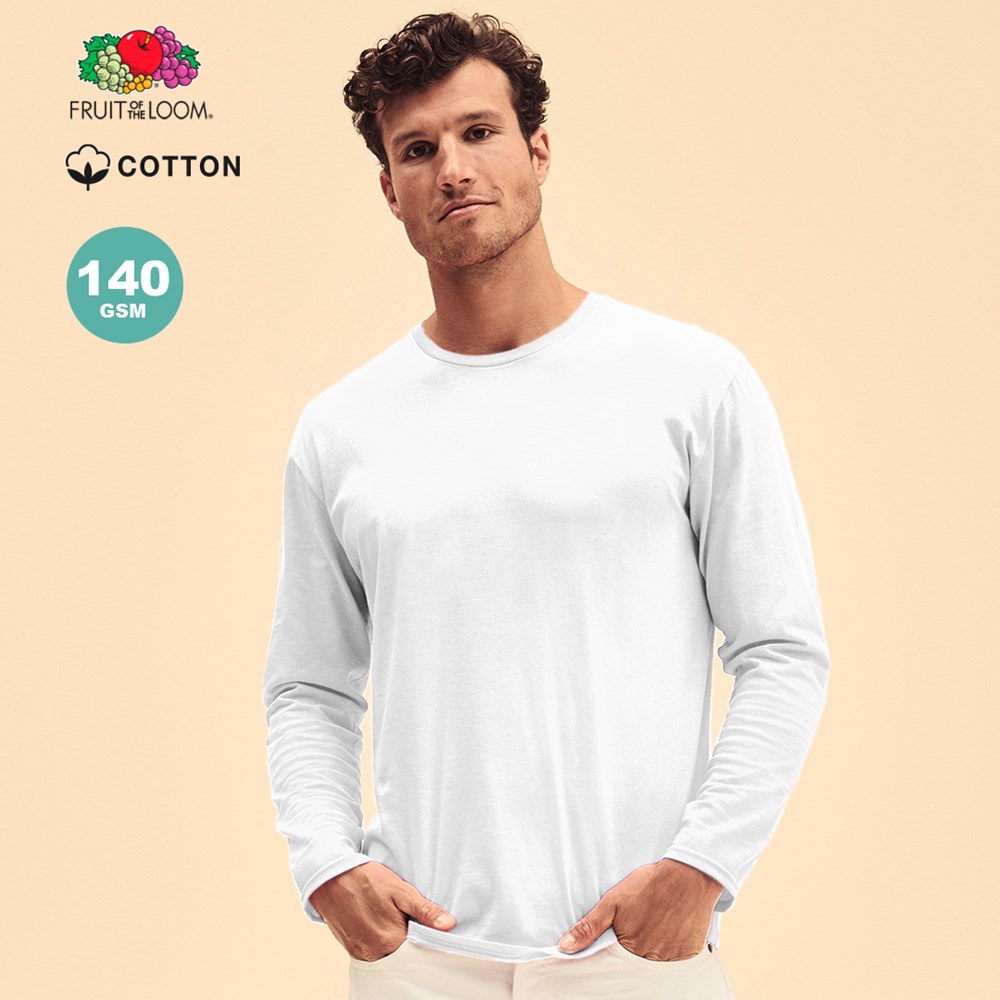 Weißes T-Shirt für Erwachsene Iconic Long Sleeve von Fruit Of The Loom. Hergestellt aus 100% gebürsteter Ringspinn-Baumwolle 140g/m2. Weiches Material und klassischer Schnitt, mit schmalem 1x1 geripptem Rundhalsausschnitt und passender Knopfleiste. Leicht abnehmbares Etikett und erhältlich in den Größen S, M, L, XL, XXL.
