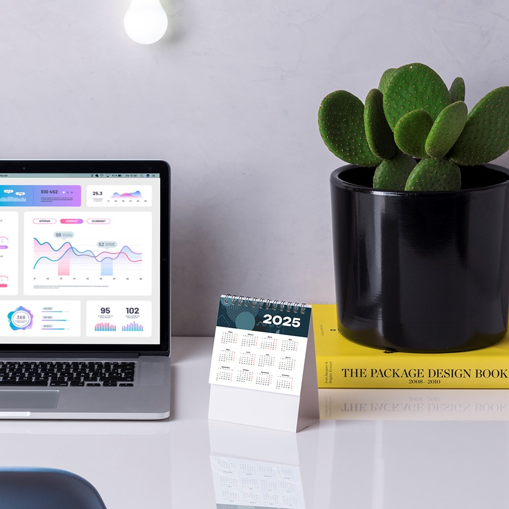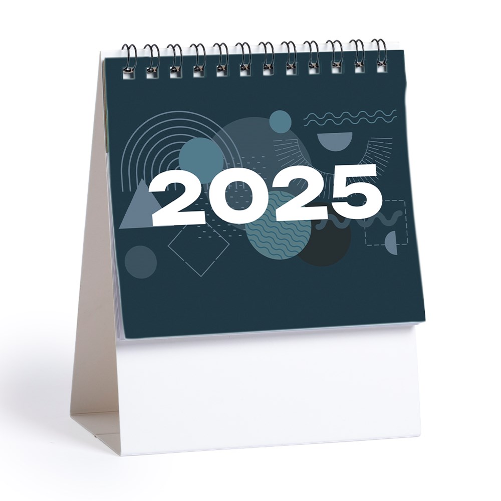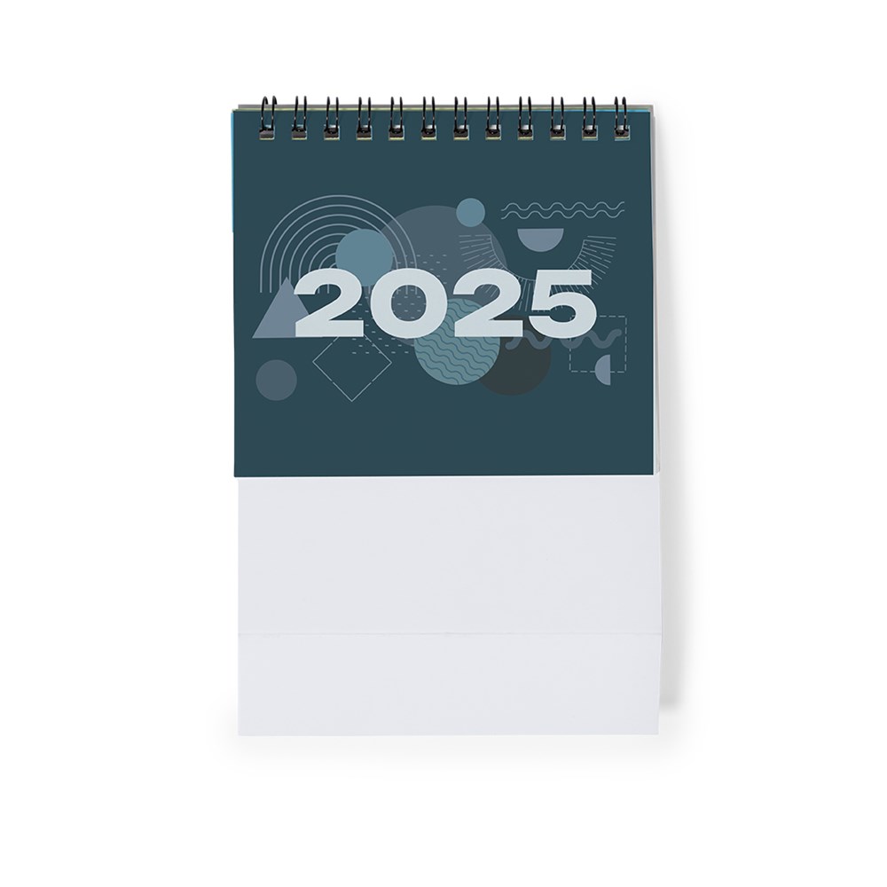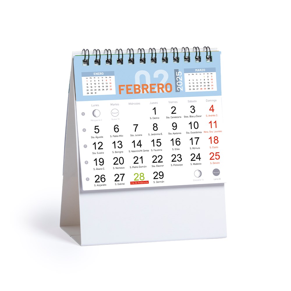 Ring-Tischkalender, dreieckig, aus Karton. Design laufender Monat/Vorheriger Monat/Nächster Monat und Kalendarium der heiligen Tage. Große Brandingfläche an beiden Seiten.