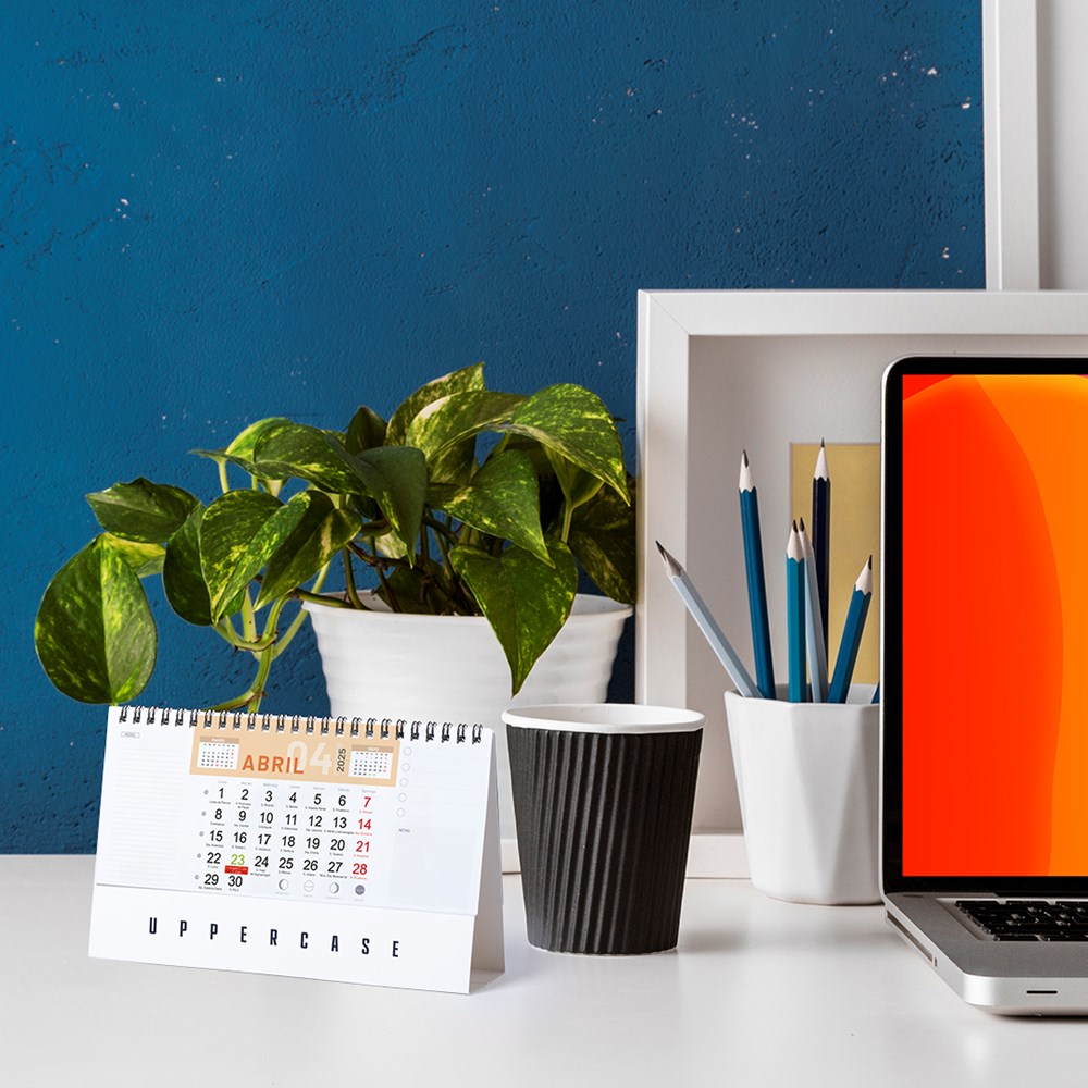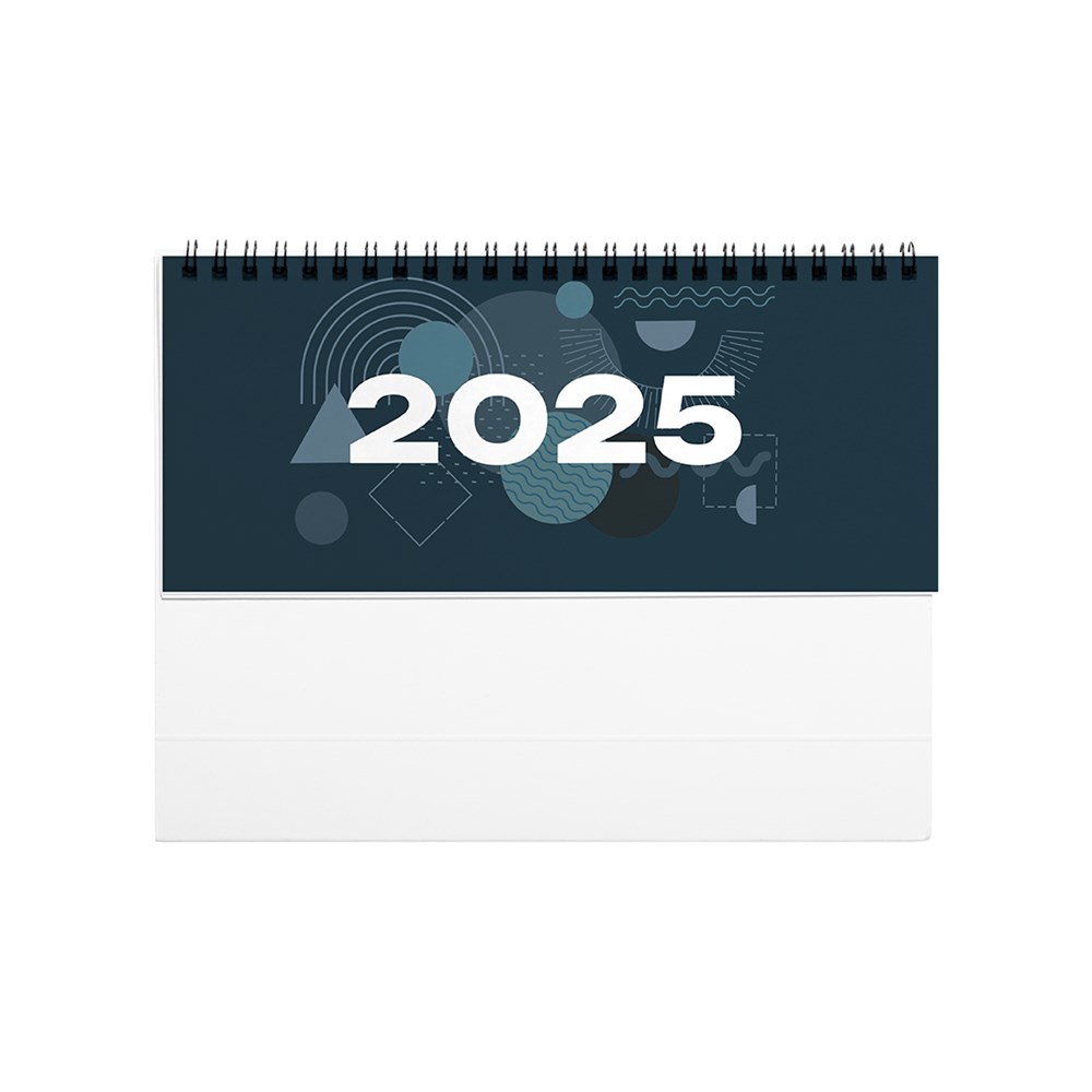 Ring-Tischkalender mit dreieckigem Körper aus Karton. Design laufender Monat/Vorheriger Monat/Nächster Monat, Kalendarium der heiligen Tage und Seiten für Notizen. Große Brandingfläche an beiden Seiten.