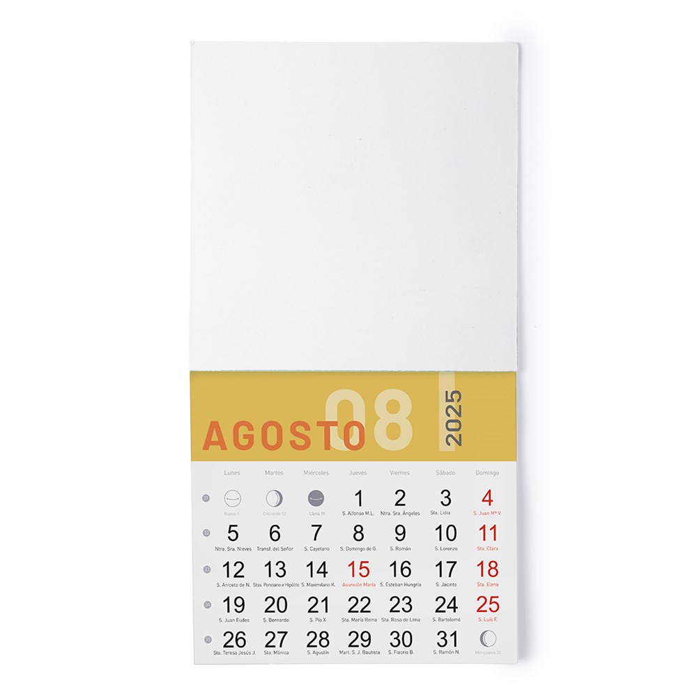 Praktischer Kalender mit Magnetseite. Aus Karton, mit fortlaufendem Monat und Heiligendarstellung. Mit großer Druckfläche.