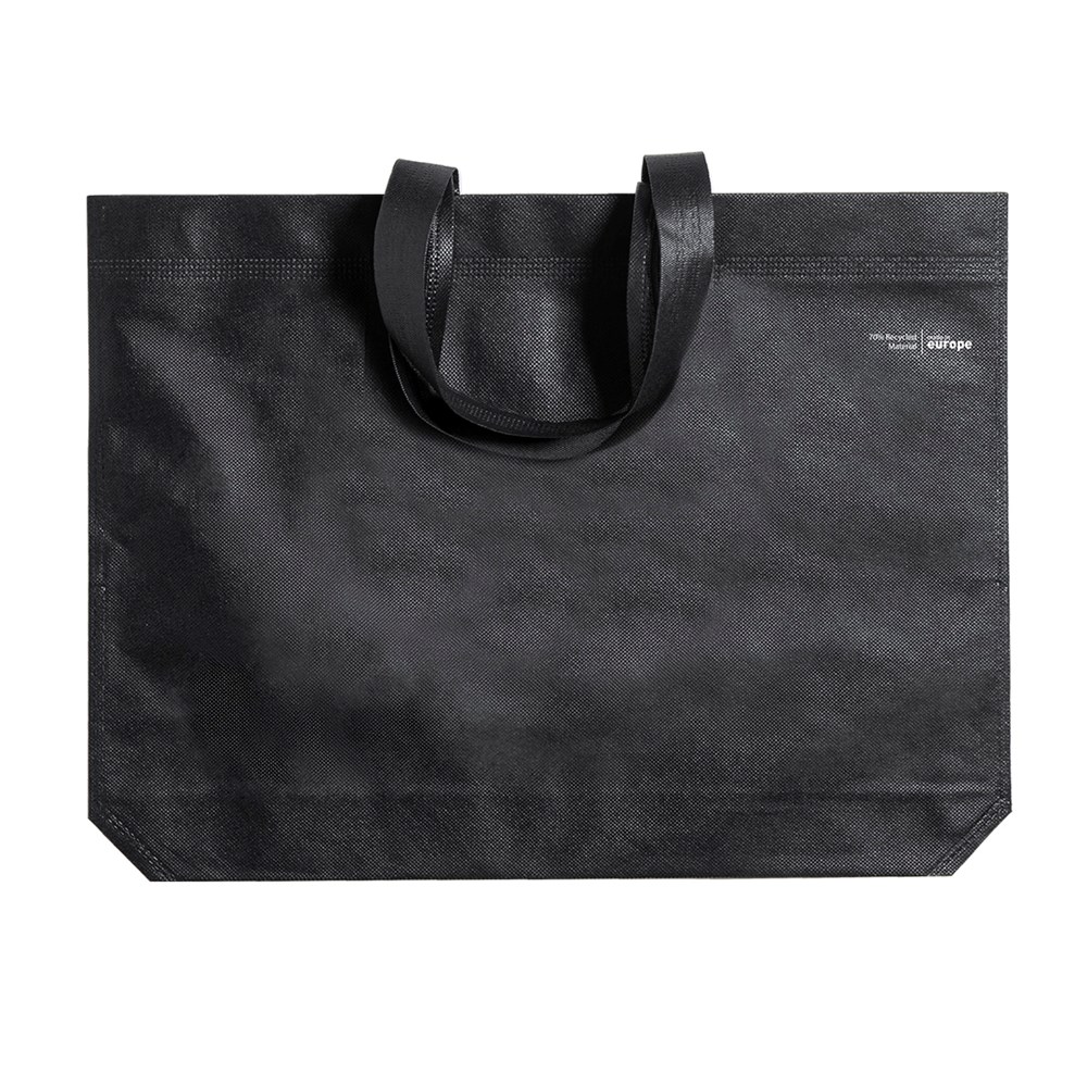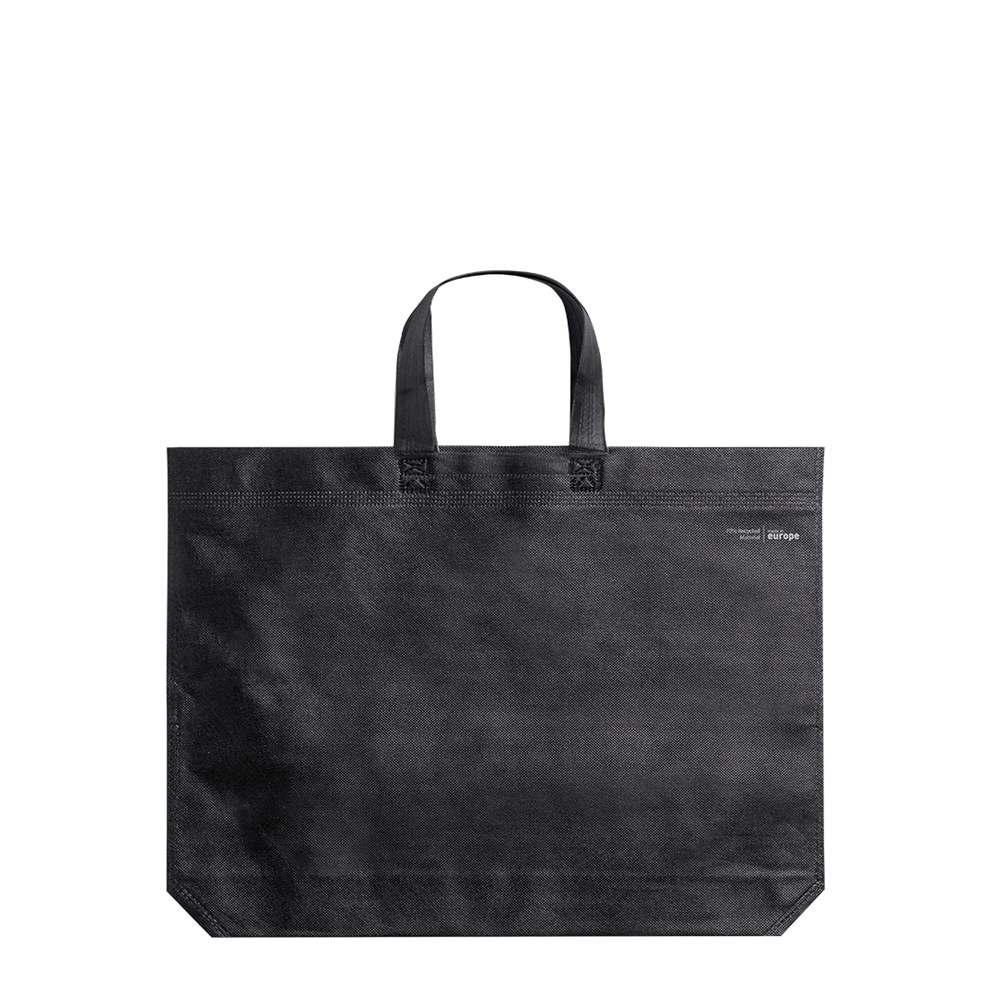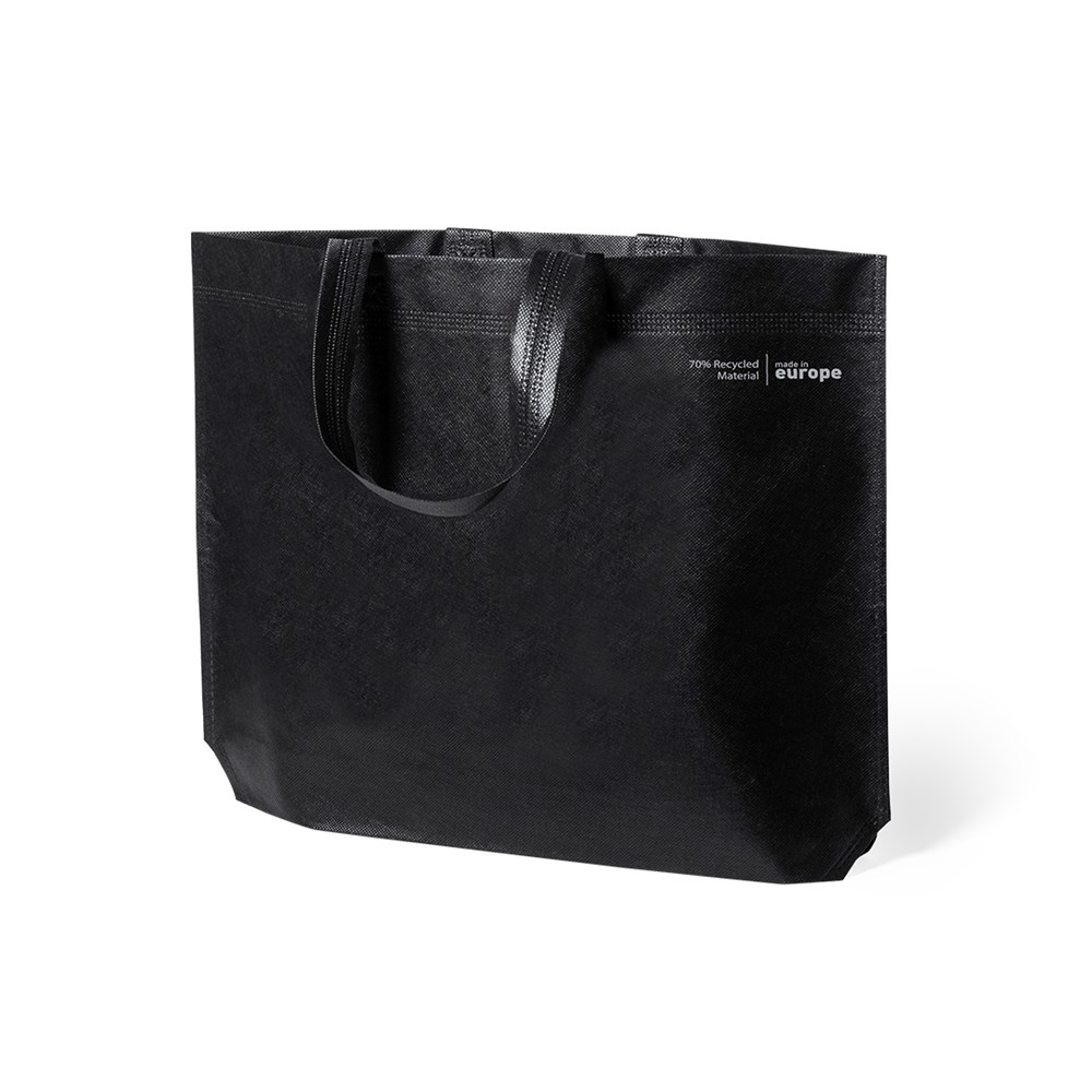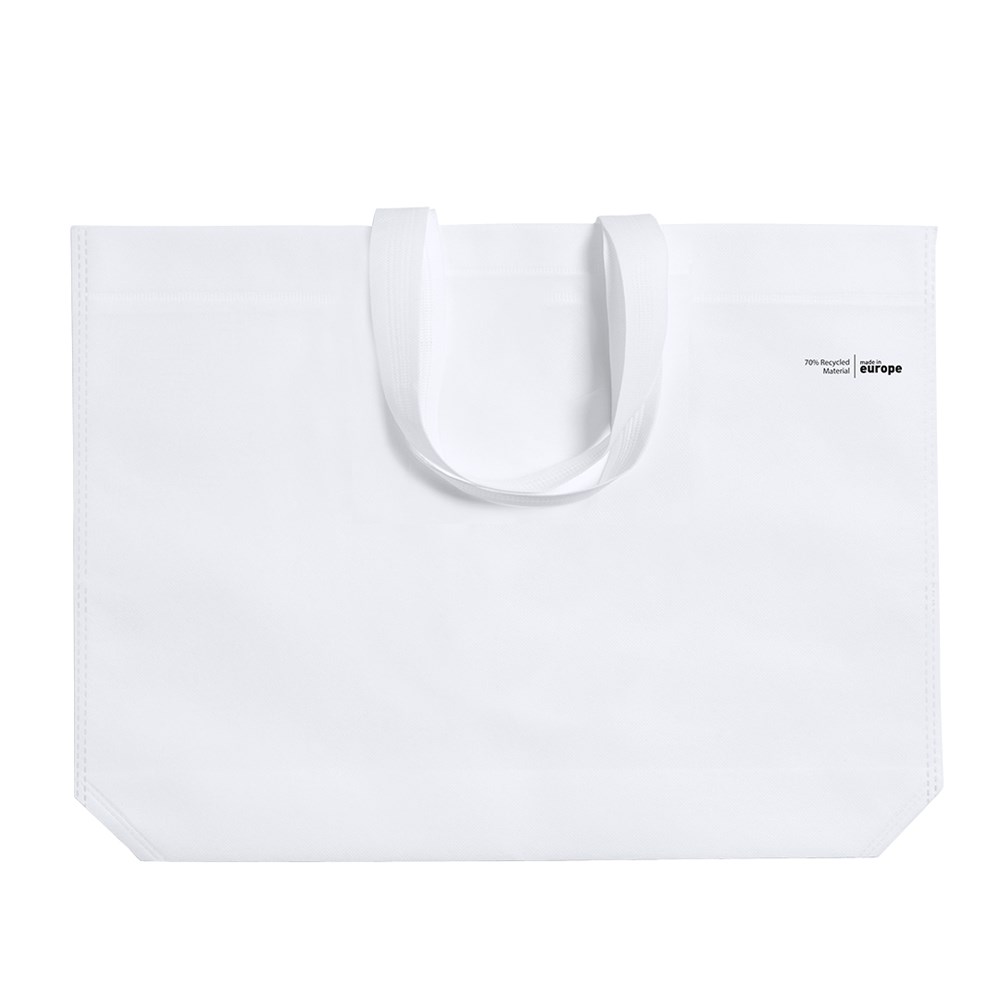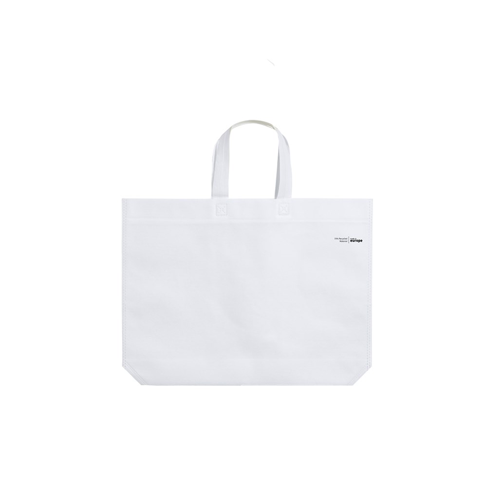 Linie "Natur" Tasche, hergestellt aus 70g/m2 recyceltem Vliesstoff. Hergestellt in Europa, mit verschweißter Oberfläche, Seitenfalte, langen Griffen und Öko/Made-Emblem auf der Tasche.