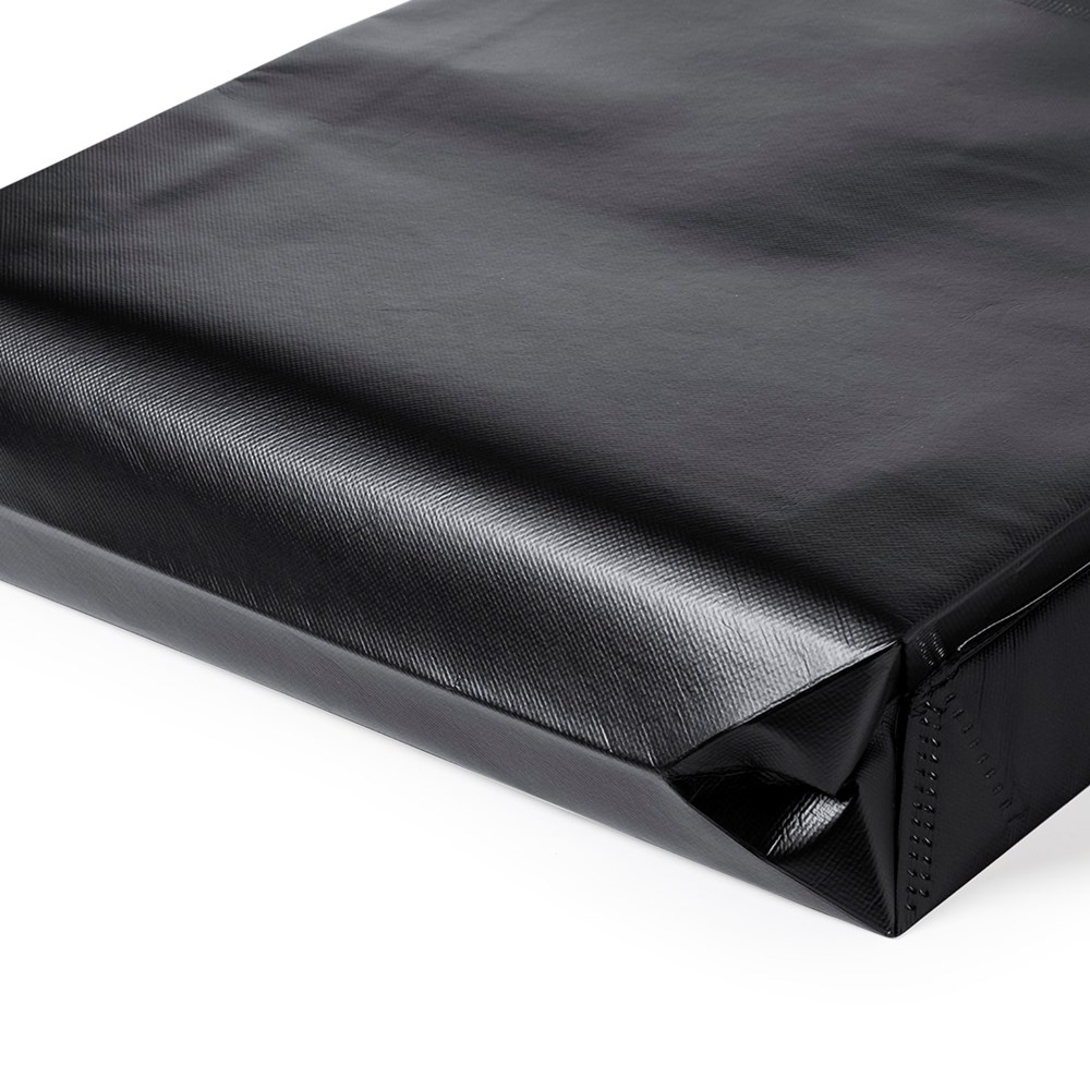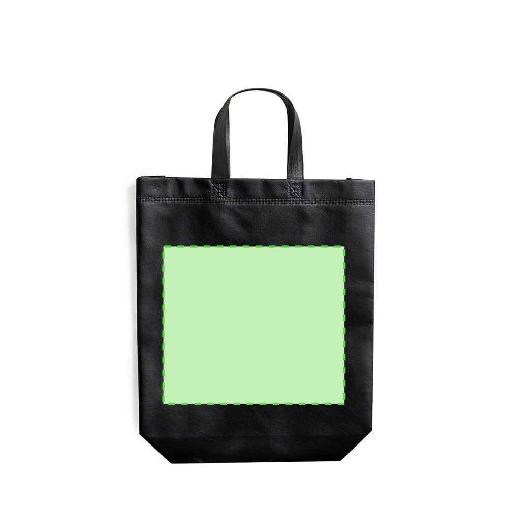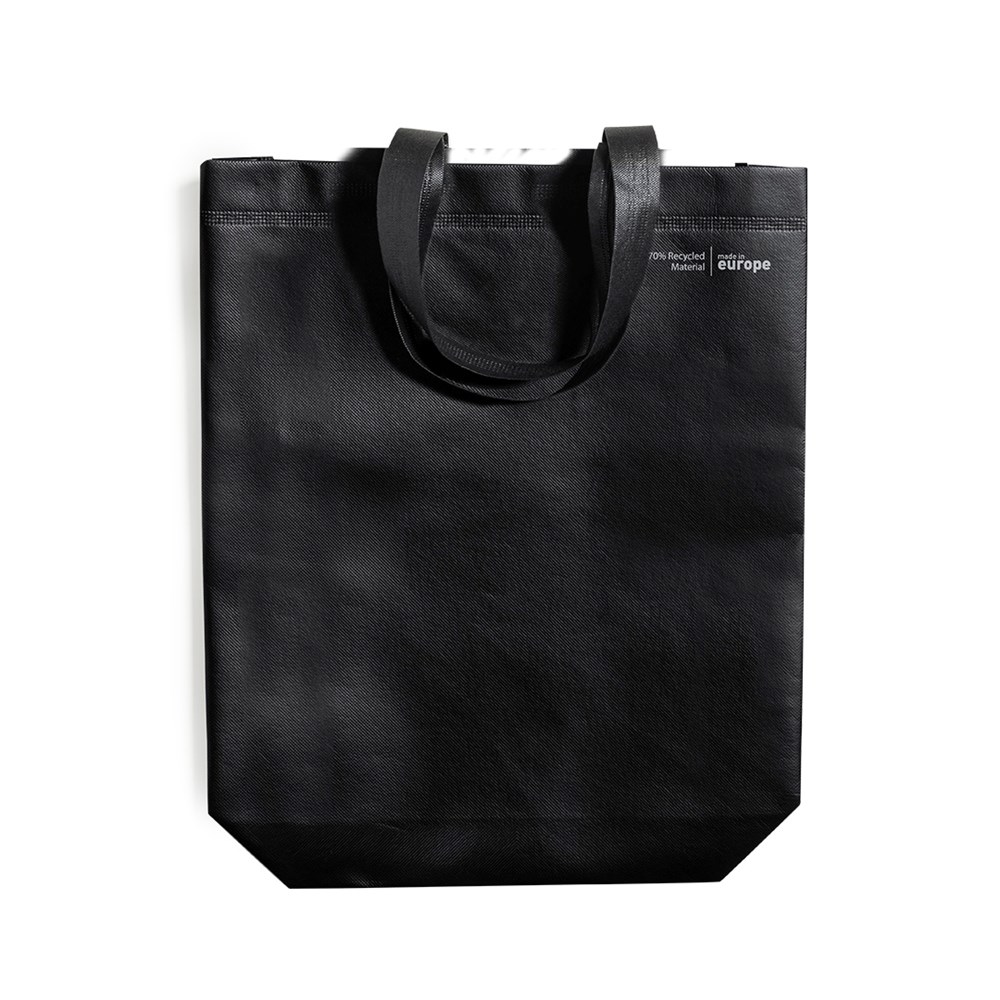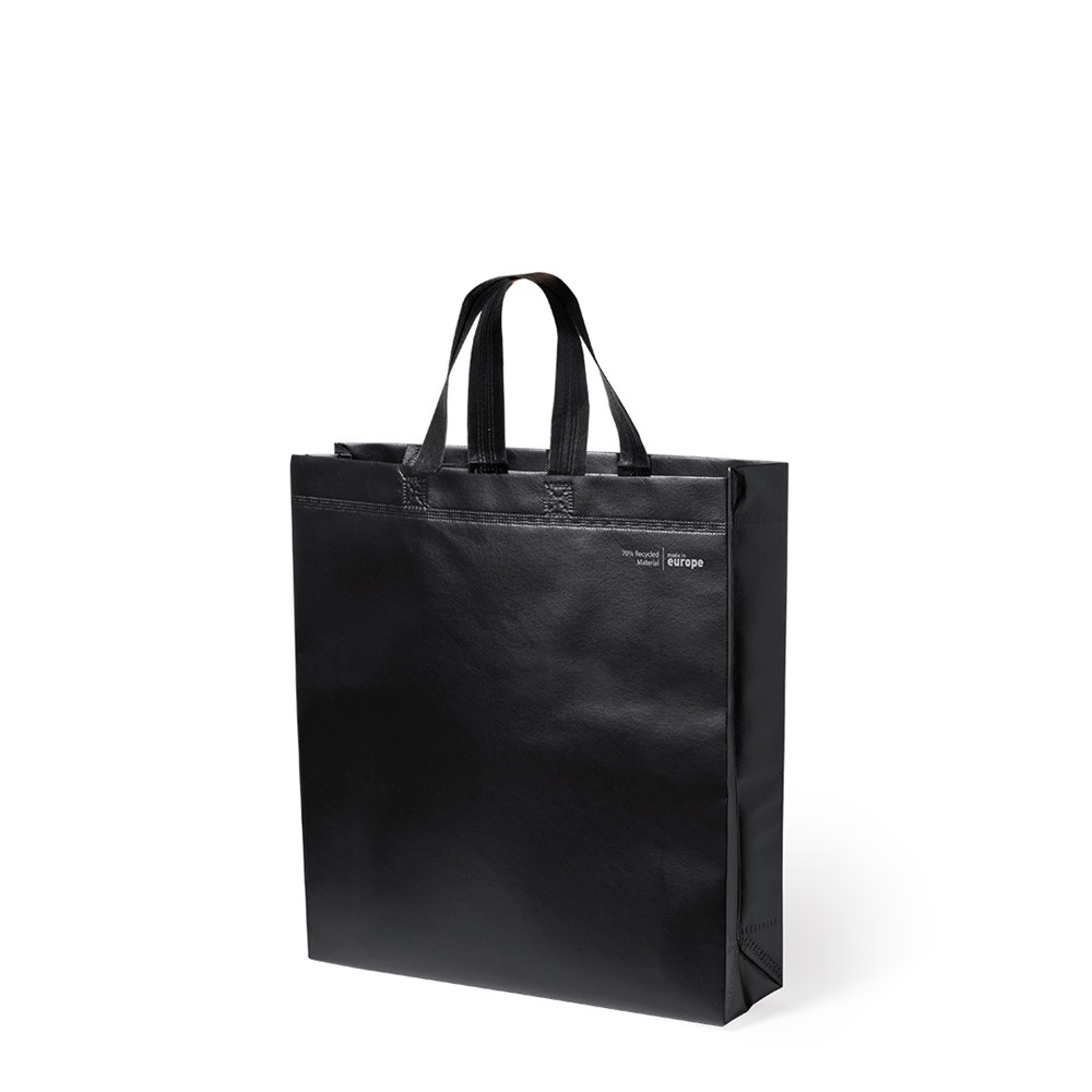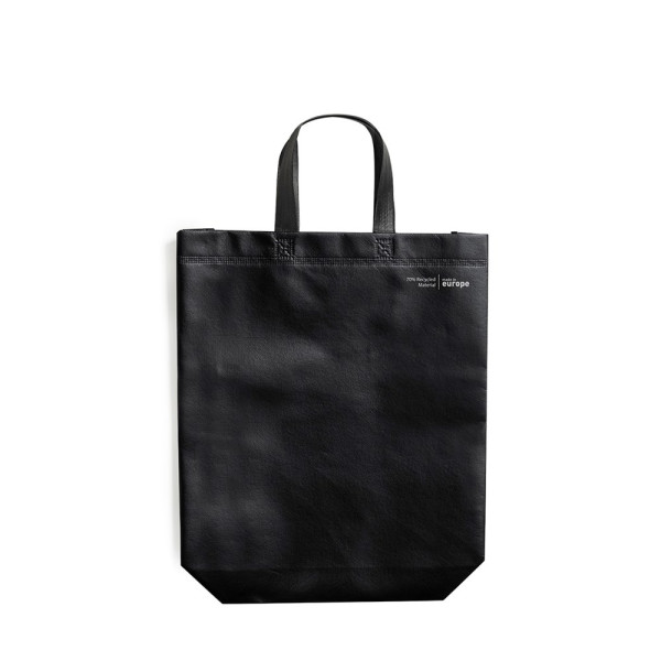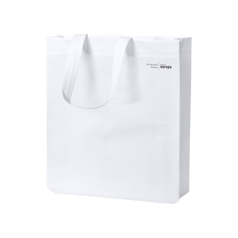 Linie "Natur" Tasche, hergestellt aus 120g/m2 recyceltem Vliesstoff mit Laminierung. Hergestellt in Europa, mit verschweißter Oberfläche, Seitenfalte, langen Griffen und Öko/Made-Emblem auf der Tasche.