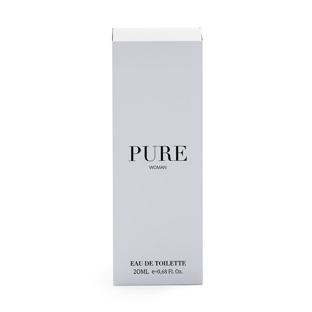 Eau de Toilette für Frauen Pure. Eine perfekte Mischung aus süßen Noten, die die moderne Silhouette der Komposition unterstreichen und ein umarmendes Gefühl vermitteln. Nachfüllbarer 20-ml-Sprühflakon mit transparentem Verschluss. Präsentiert in einer hochwertigen Designbox.
