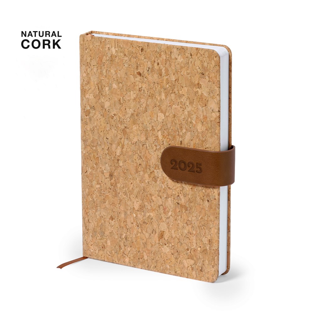 Tagebuch im Format A5 aus Naturkork. Mit festem Einband, Magnetverschluss aus PU und passendem Stifthalter. Tagesseiten-Design, Bereich für tägliche Notizen und Lesezeichen aus Stoff. In 2 Sprachen: Spanisch und Englisch. Präsentiert in einer Kraftbox. Hergestellt aus pflanzlichen Bestandteilen, um die Verwendung natürlicher Rohstoffe zu fördern und die Schadstoffemissionen zu reduzieren.