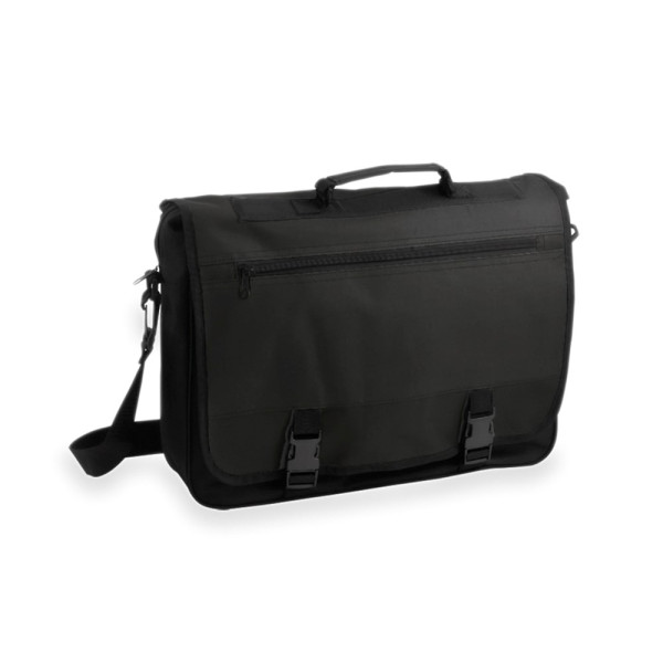 Dokumententasche aus 600D Polyester mit Klettverschluss und eleganter schwarzer Frontleiste. Mit verstärkten Tragegriffen und verstellbarem Schultergurt. Mit Innenfächern für Kugelschreiber sowie Smartphone-Hülle aus PVC mit Touch-Funktion.