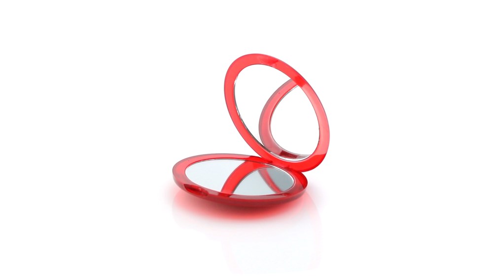 Klappspiegel in vielen kräftigen, halbtransparenten Farben. Mit zwei Innenspiegeln mit 1x/2x Vergrößerung.