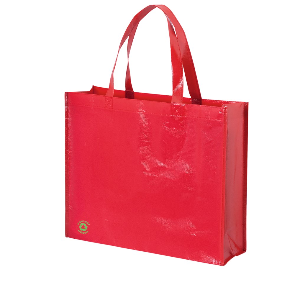 Non-Woven-Tasche aus laminiertem Faservlies in glänzender Ausführung und vielen verschiedenen lebendigen Farben. Mit 46 cm langen, verstärkten Henkeln, Steppnähten und Zwickel sowie Paspelierung.