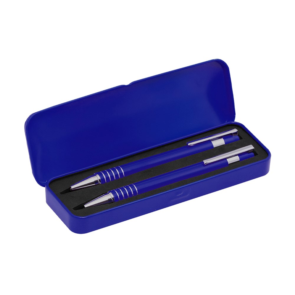 Set aus Druck-Kugelschreiber und Druck-Bleistift mit originellem, zweifarbigem Design. Beide in geschmeidiger Metall-Ausführung in lebendigen Farben mit Kontrastdetails in Silber. Mit geriffeltem Griff. Präsentiert in einem robusten, individuellem Metall-Etui mit Schaumstoff im Inneren. Kugelschreiber mit blauer Tinte und Bleistift mit 0,7 mm Minen.