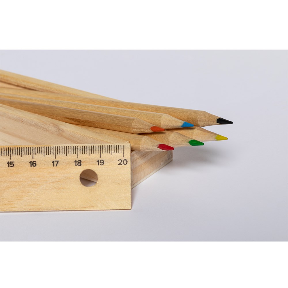 Set aus 6 Stiften in Etui aus Naturholz. Mit rundem Körper in Naturfarbe und farbigen Minen. Rutschfester Deckel mit integriertem 20 cm Lineal.