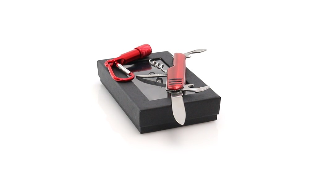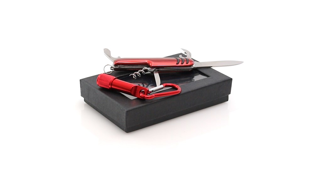 Set aus Multifunktions-Taschenmesser mit 7 Funktionen sowie Taschenlampe mit Karabiner - mit Aluminiumgehäuse in verschiedenen Farben. Präsentiert in einer individuellen Box mit Fenster, ausgepolstert mit Schaum. Knopfzellen inklusive.