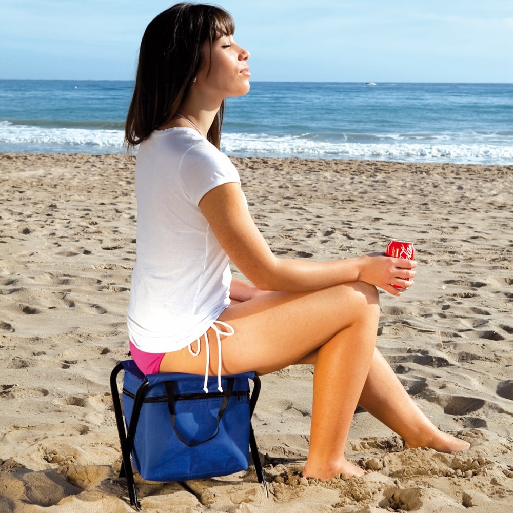 Klappstuhl aus Aluminium mit integrierter Kühltasche im Sitz in verschiedenen Farben. Sitzfläche und Kühltasche aus strapazierfähigem 600D Polyester mit verstärkten Nähten. Mit Reißverschluss und praktischen Nylon-Tragegriffen sowie Verstärkungsstreifen aus Nylon an den Beinen. Isotherm-Innenraum mit Aluminium-Finish.