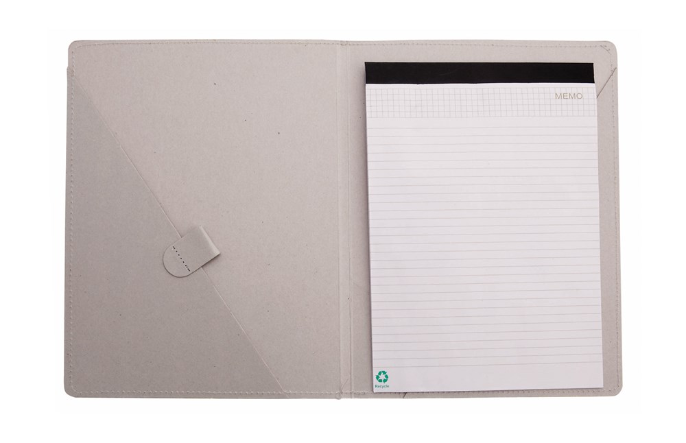 Mappe mit originellem Gummibandverschluss aus widerstandsfähigem Recyclingkarton mit Verstärkungsnähten. Mit Notizblock mit 20 linierten Blättern, dreieckiger Klappentasche und Stifthalter.