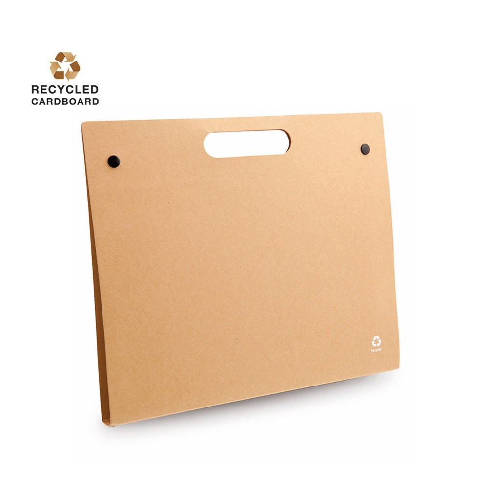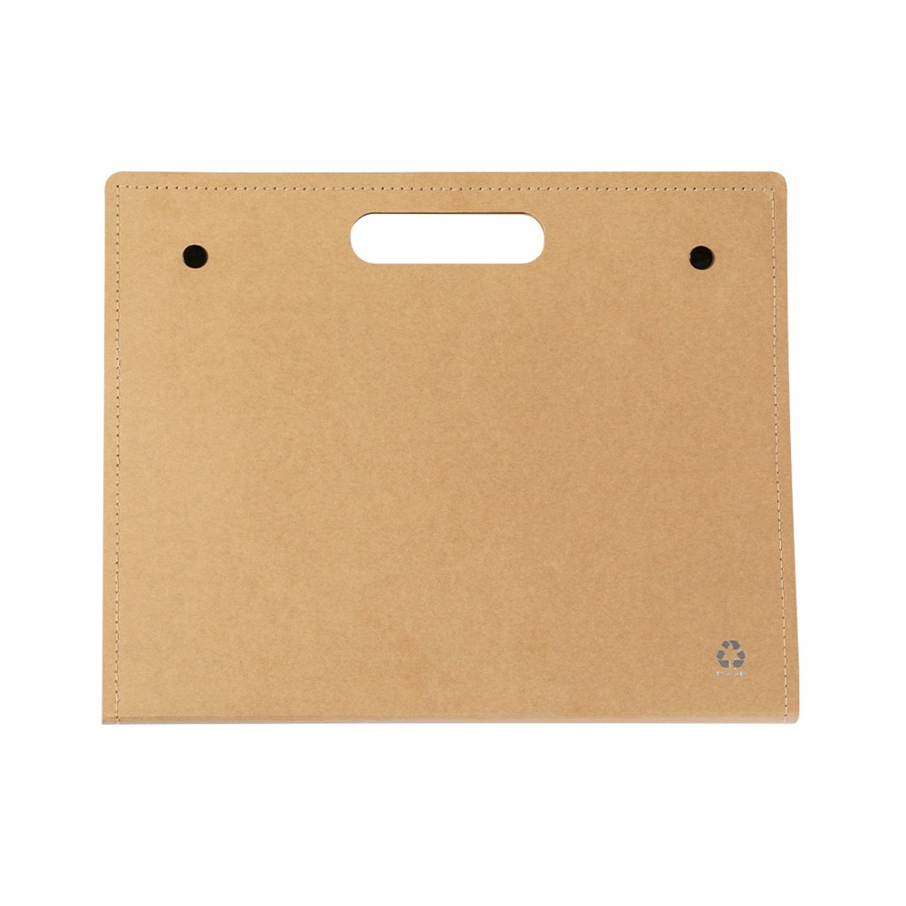 Ökologische Mappe mit zweifachem Druckknopfverschluss aus flexiblem Recyclingkarton und praktischem, integriertem Griff. Mit herausnehmbarem Block mit 25 linierten Blättern, 25 großen Haftnotizen und 125 Mini-Haftnotizen sowie Klappentasche und Kugelschreiberhalter.