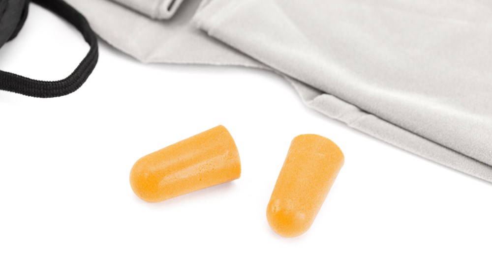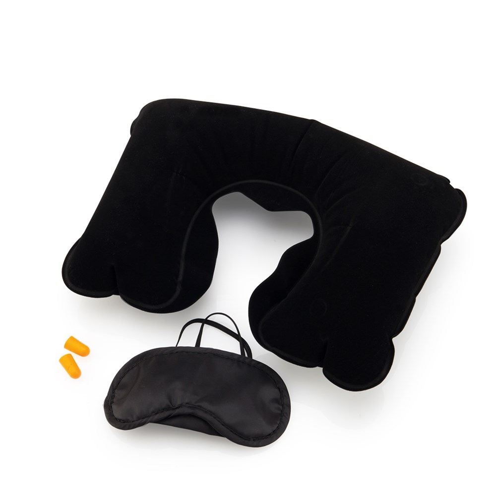 3-teiliges Reise-Set in weichem Wildleder-Etui in leuchtenden Farben. Enthält eine weiche und bequeme Mikrofaser-Maske in Schwarz mit farblich passendem Doppel-Gummiband für einen komfortablen Sitz, ein aufblasbares Nackenkissen aus Wildleder sowie Ohrenstöpsel aus angenehmem EVA-Material in Orange.