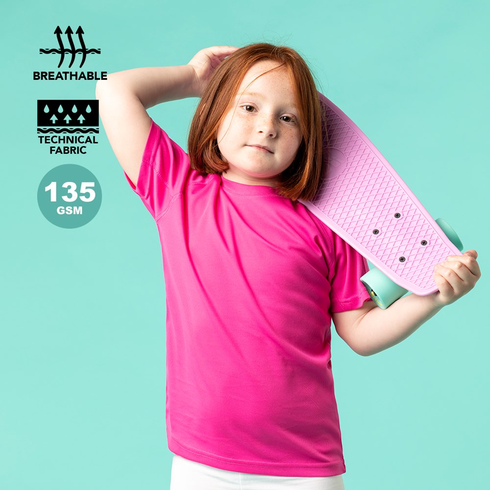 Funktions-T-Shirt für Kinder aus 100 % atmungsaktivem Polyester (135 g/m2). Erhältlich in vielen lebendigen Farben und den Größen 4-5, 6-8 und 10-12.