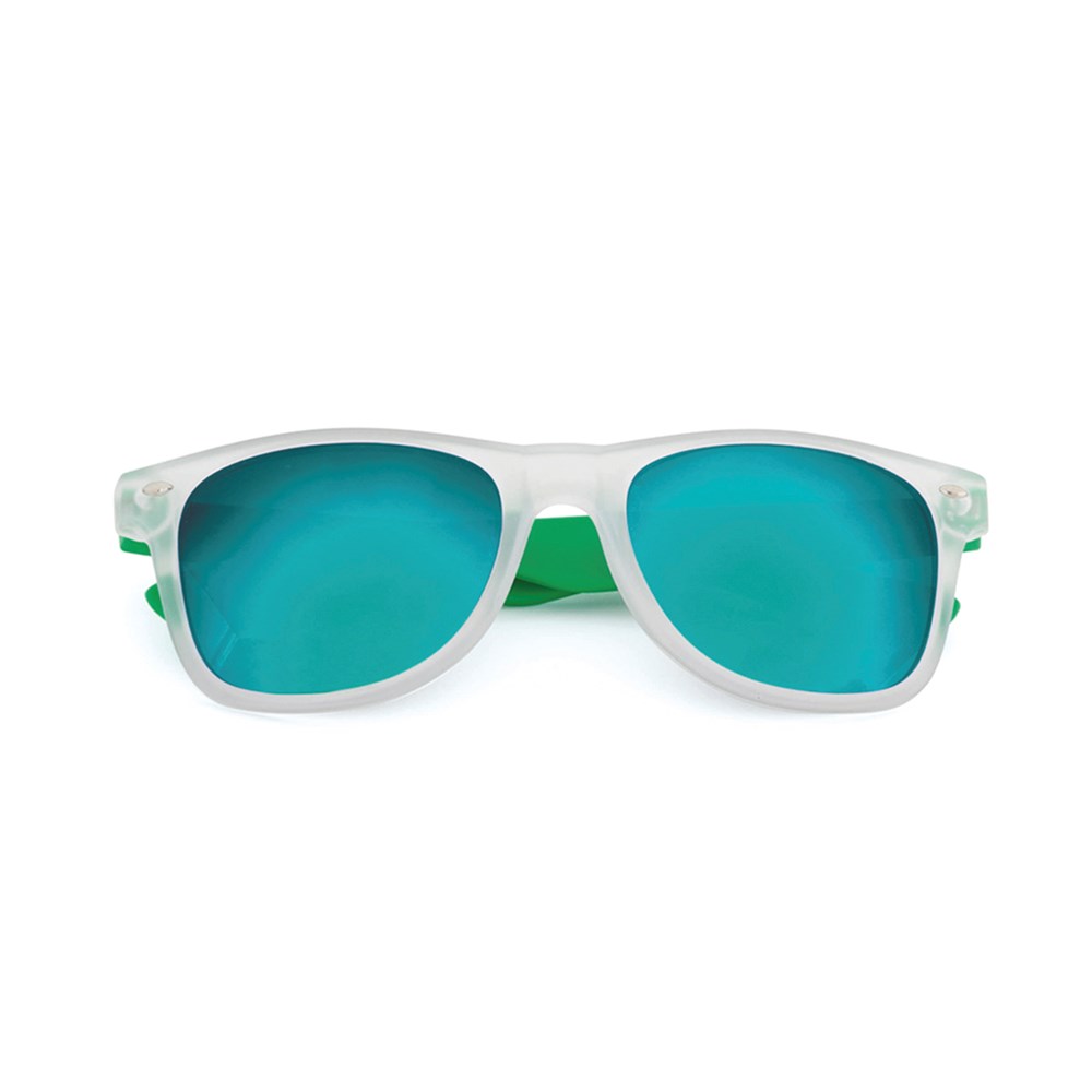 Sonnenbrille mit UV-400-Schutz mit klassischem Design. Mit halbtransparentem Rahmen, Bügeln in fröhlichen Farben und farblich passenden, verspiegelten Gläsern.