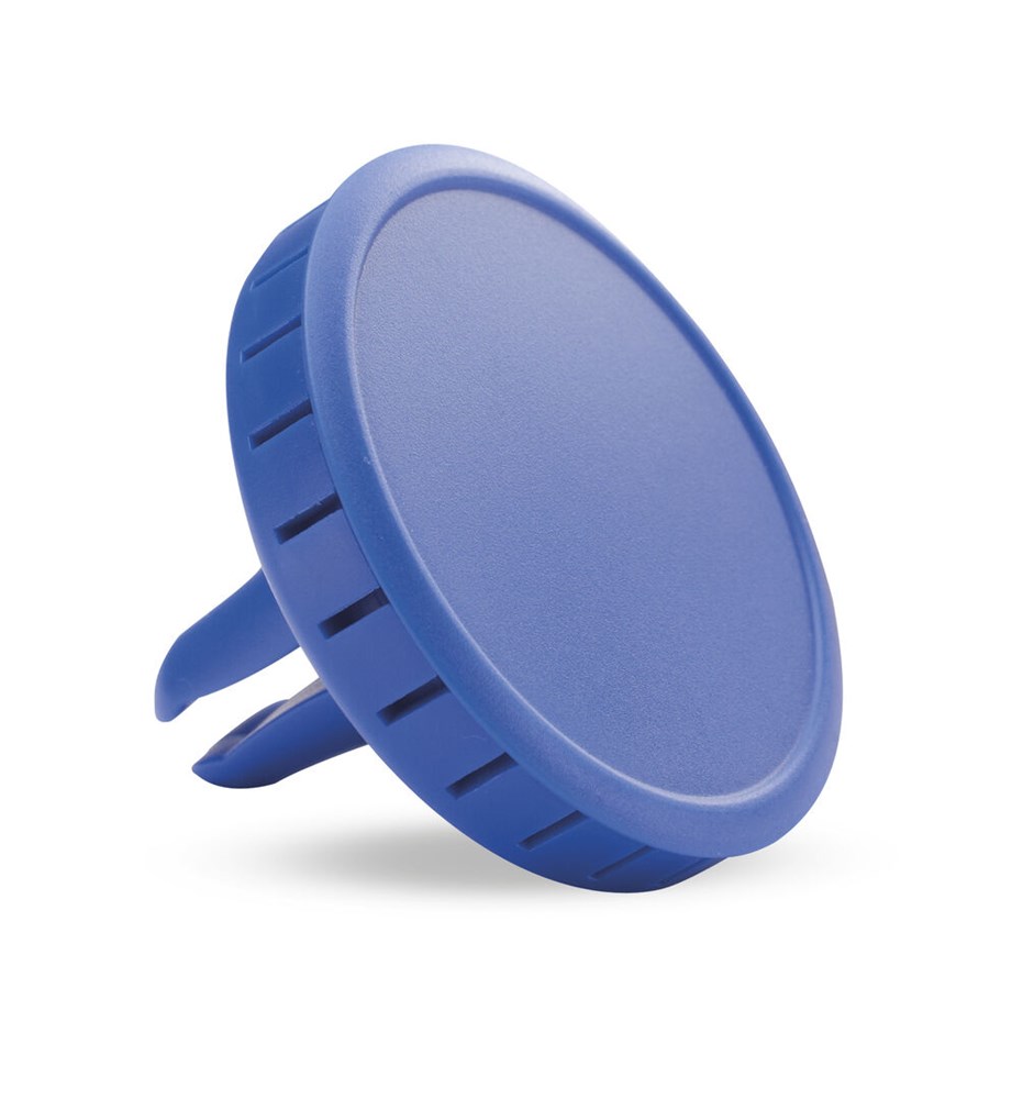 Lufterfrischer mit Zitronenaroma für die Befestigung an der Auto-Lüftung. Mit Gehäuse in fröhlichen Farben und spezieller Stanzung für die Personalisierung mittels Doming / 3D Gel-Aufklebern.